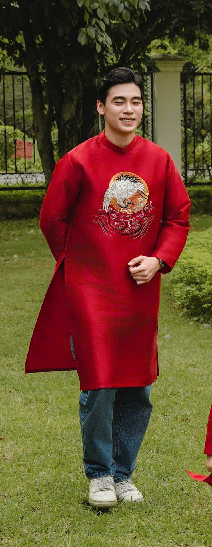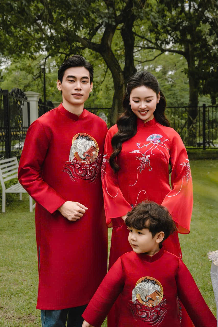 B121 2089 Áo only - Áo dài bố thêu sếu đầu đỏ màu đỏ