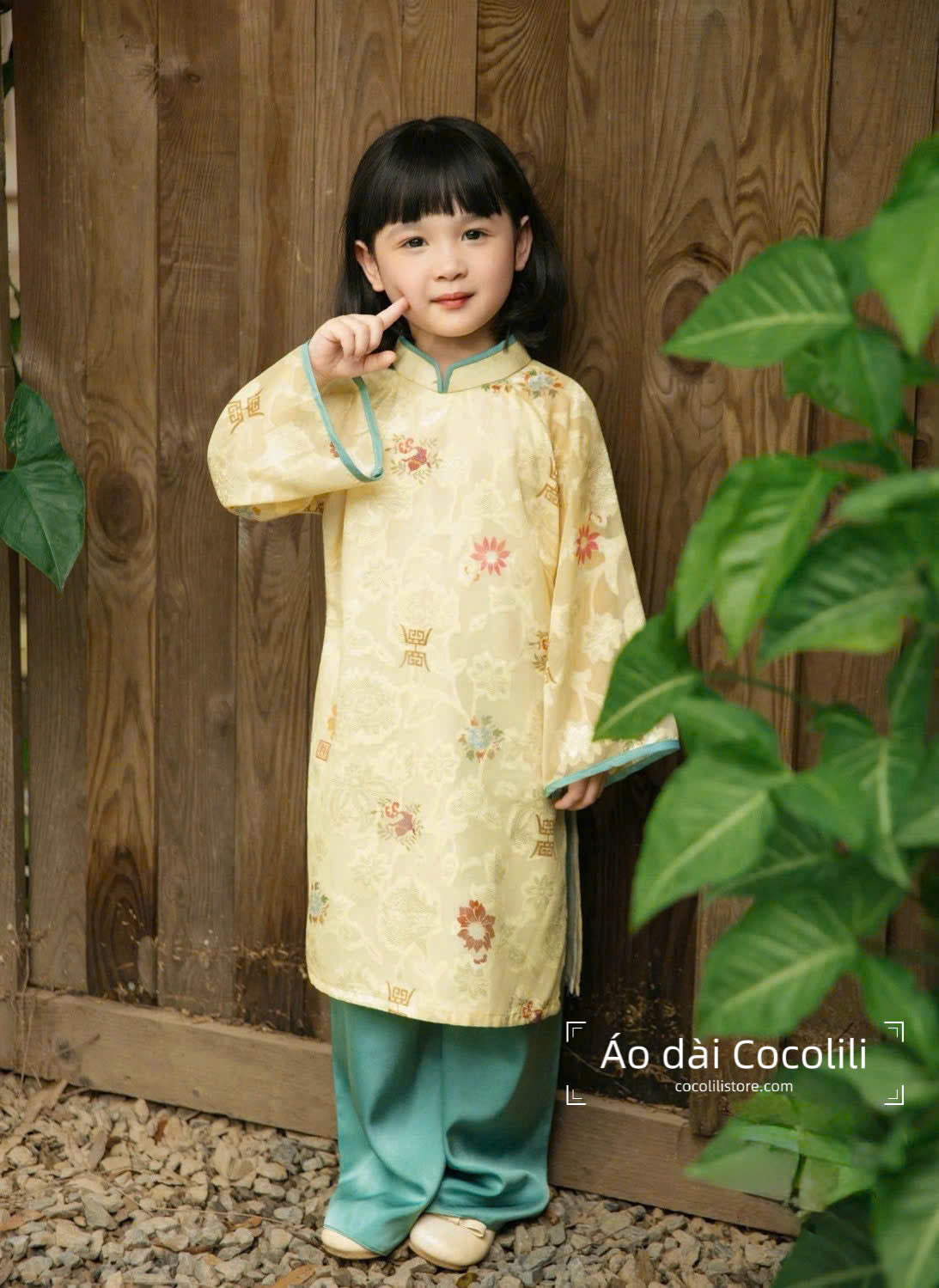 B140 Bộ áo dài nữ (mẹ) Áo + quần - Áo dài dáng suông màu vàng nhạt