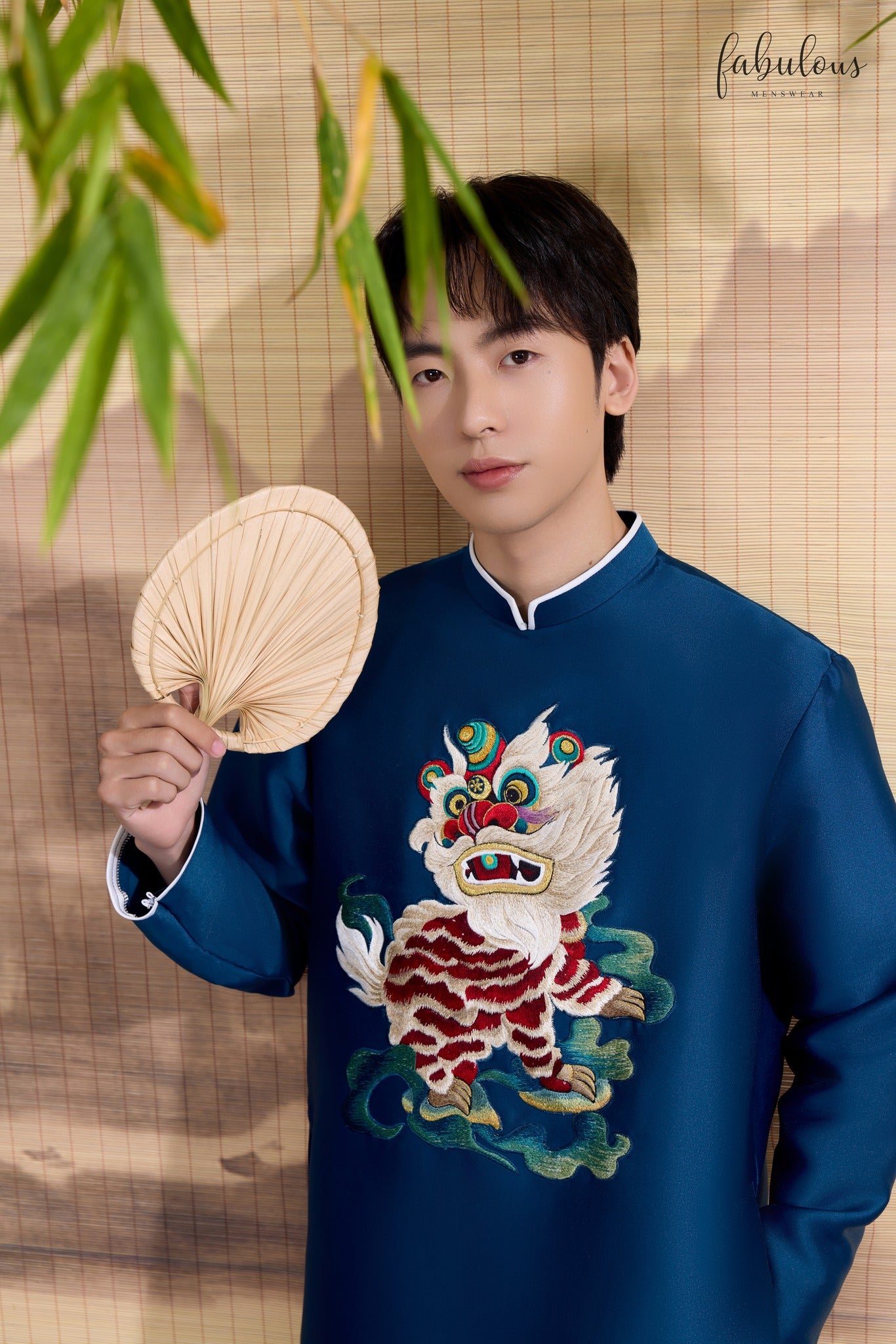 B85 - Áo dài nam vân nổi thêu màu xanh dương