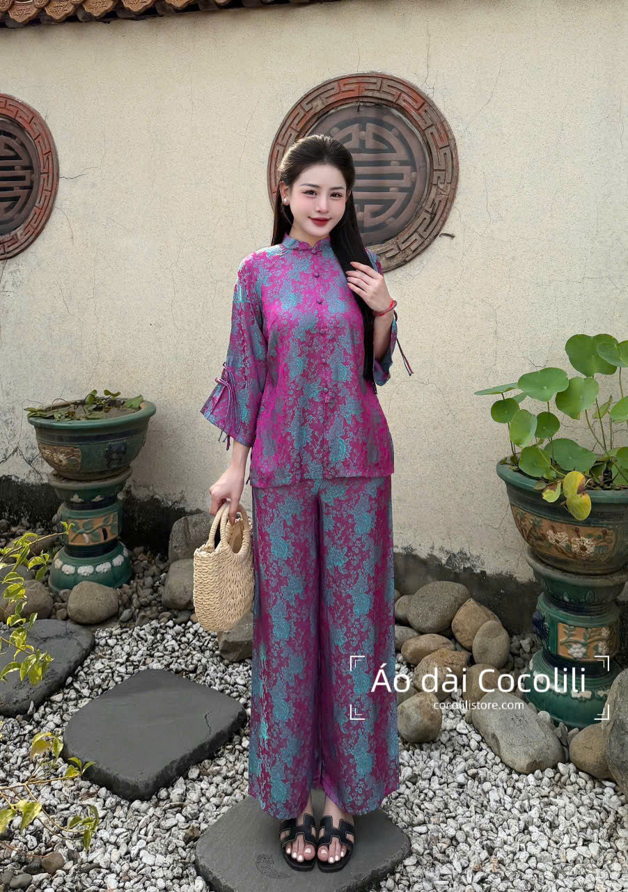BB27 2360 Áo + quần - Bộ pháp phục lụa 2 da tím ánh xanh
