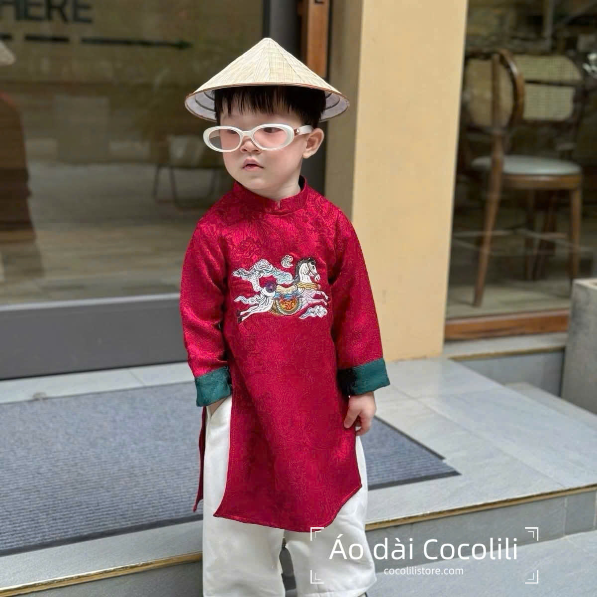BT81 2392 Áo only - Áo bé trai gấm đỏ thêu ngựa