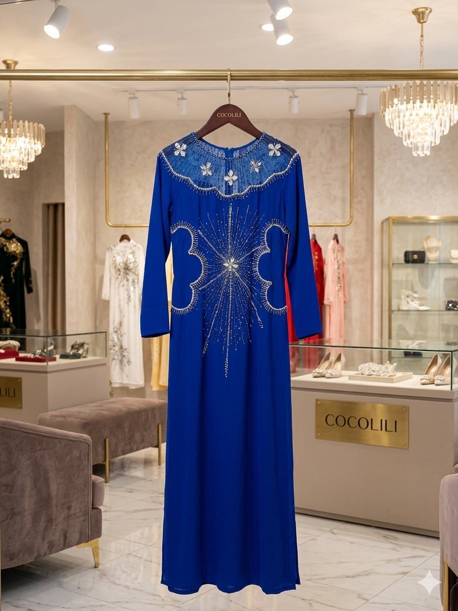S20261 Áo only no pants - Áo dài thiết kế xanh coban đính kết