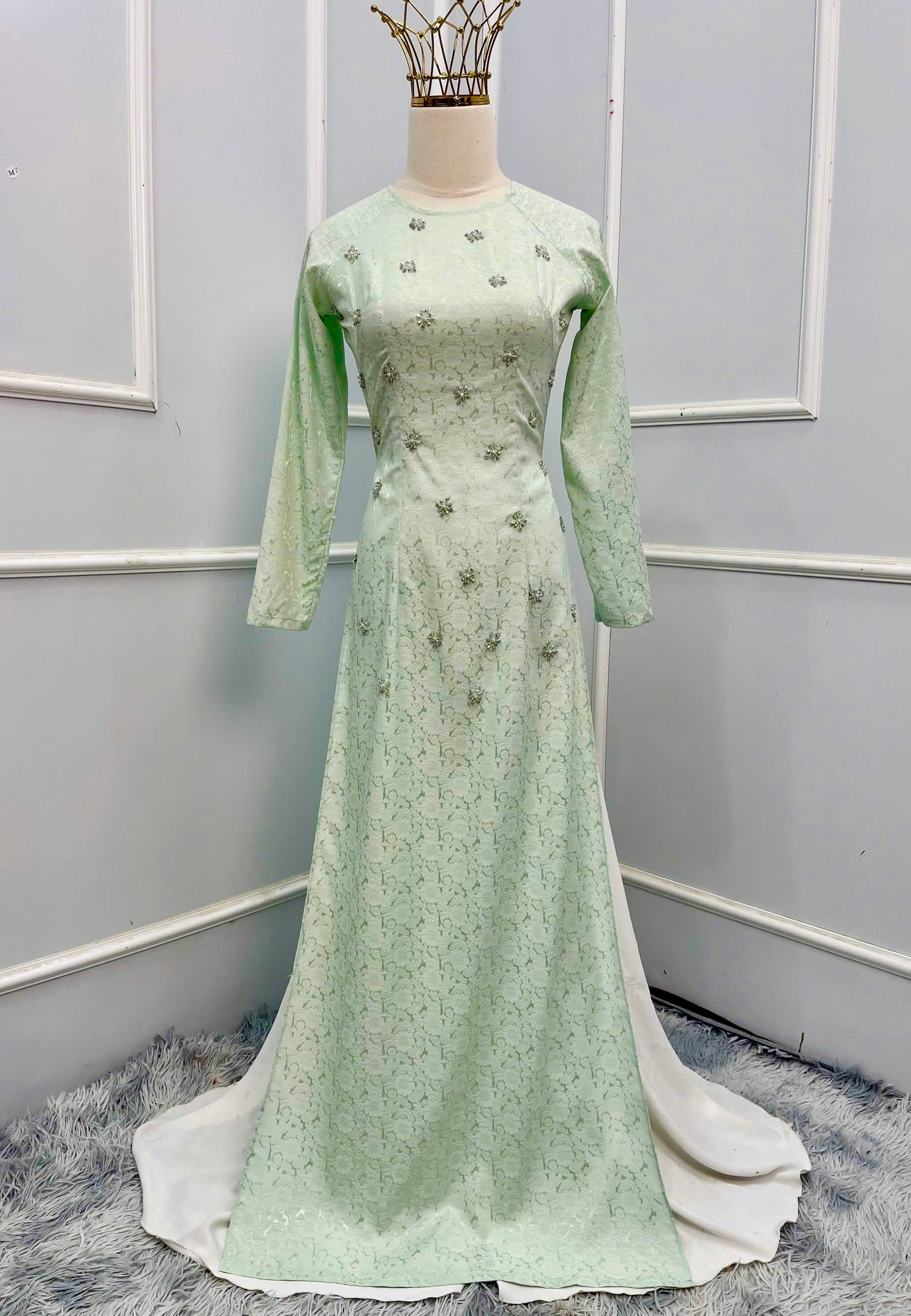 H101 - Áo dài Lụa hoa trà xanh ngọc đính đá
