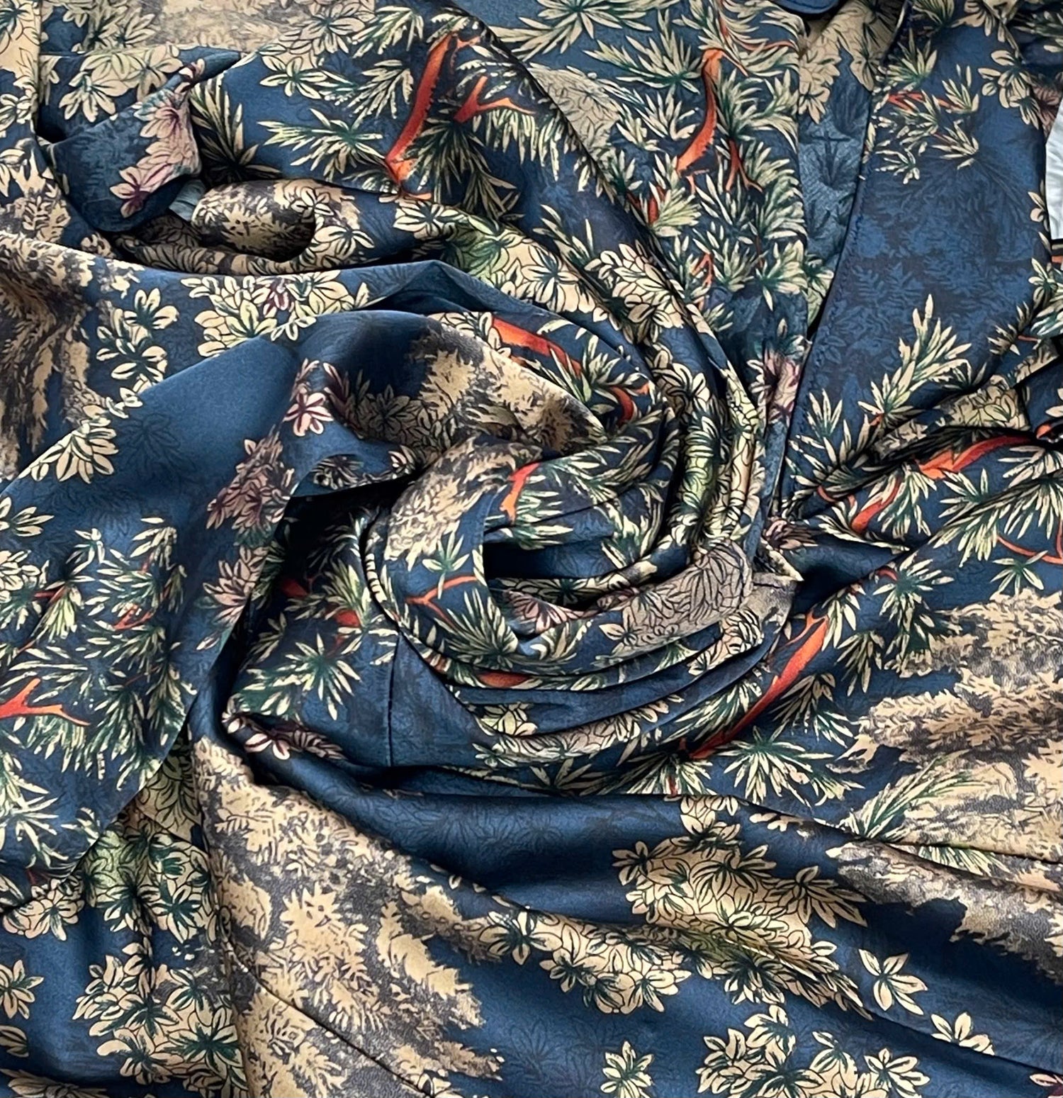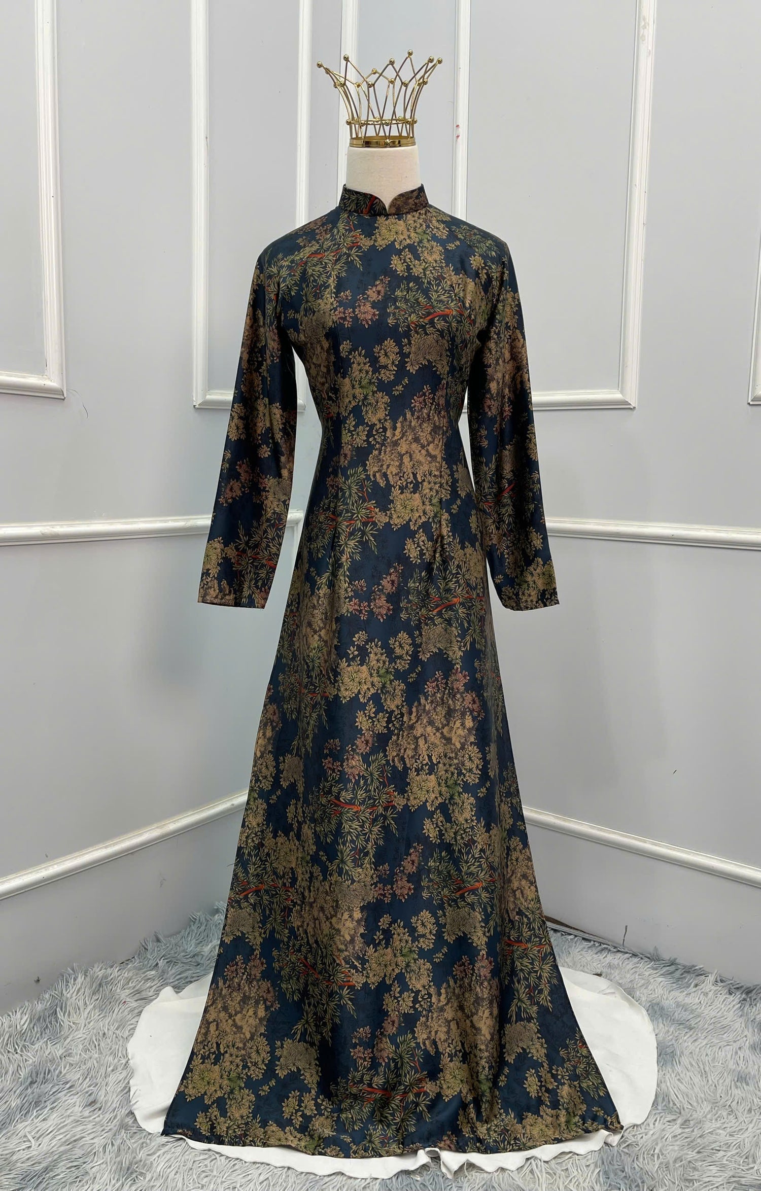 H132 Áo only - Áo dài lụa in hoa lá màu xanh than