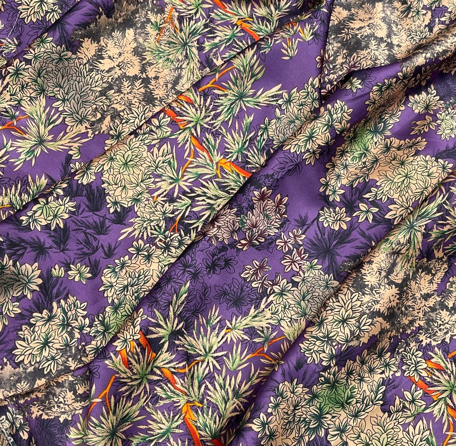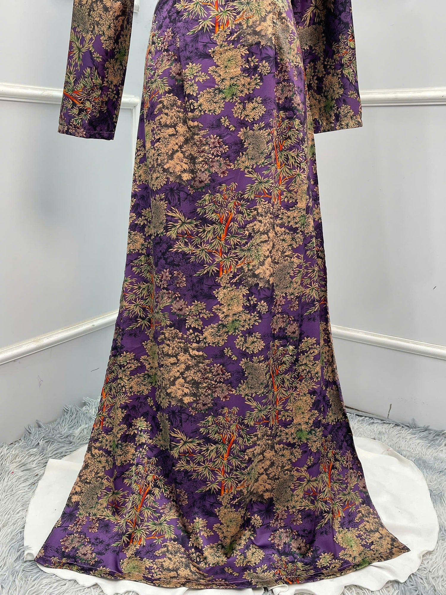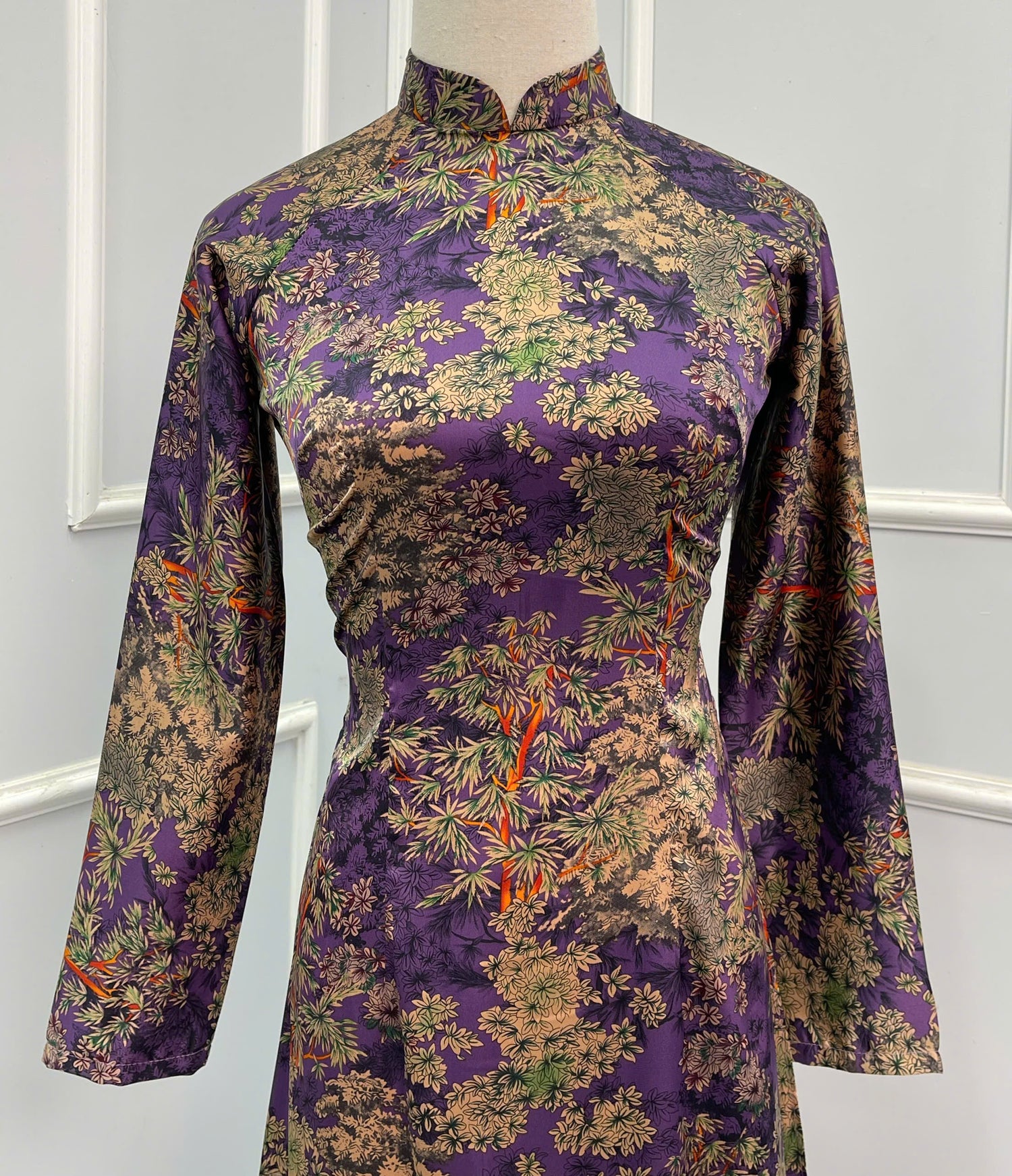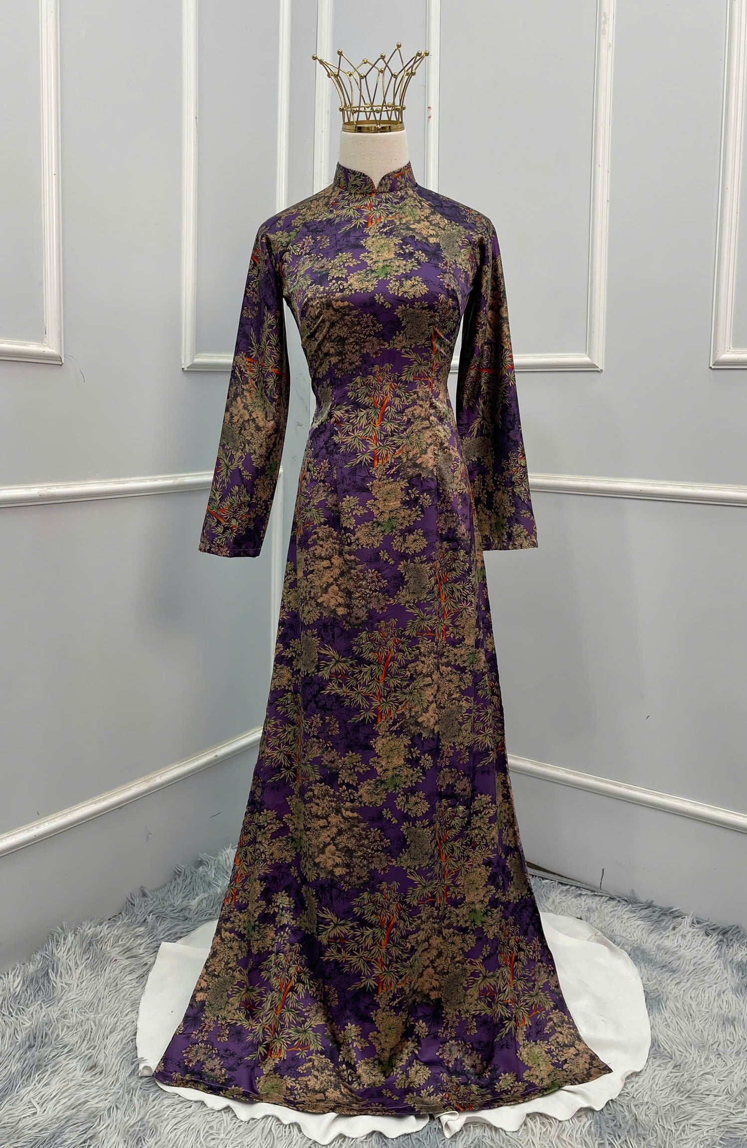 H133 Áo only - Áo dài lụa in hoa lá màu tím than
