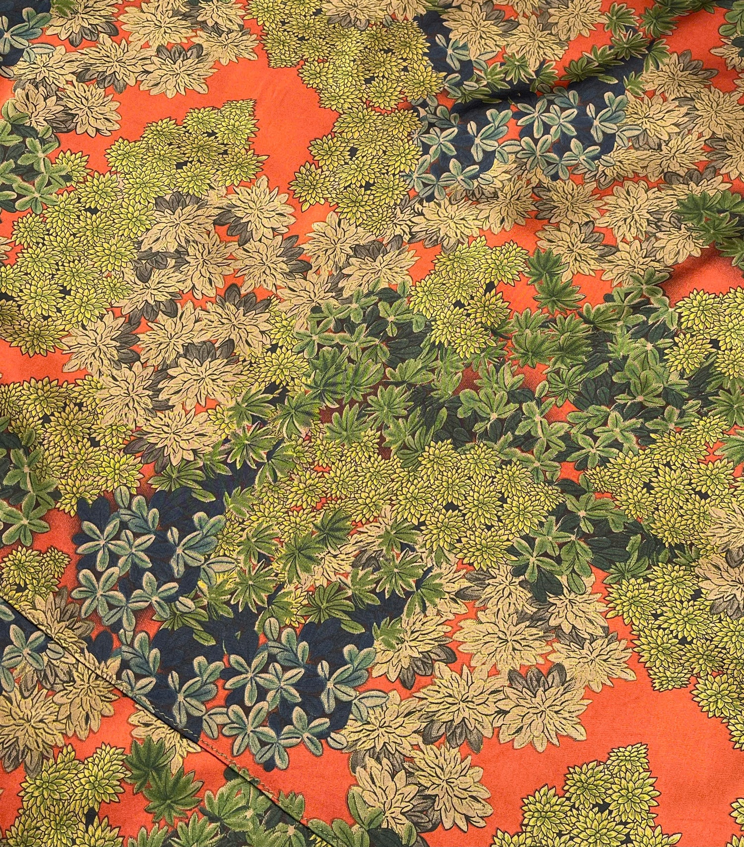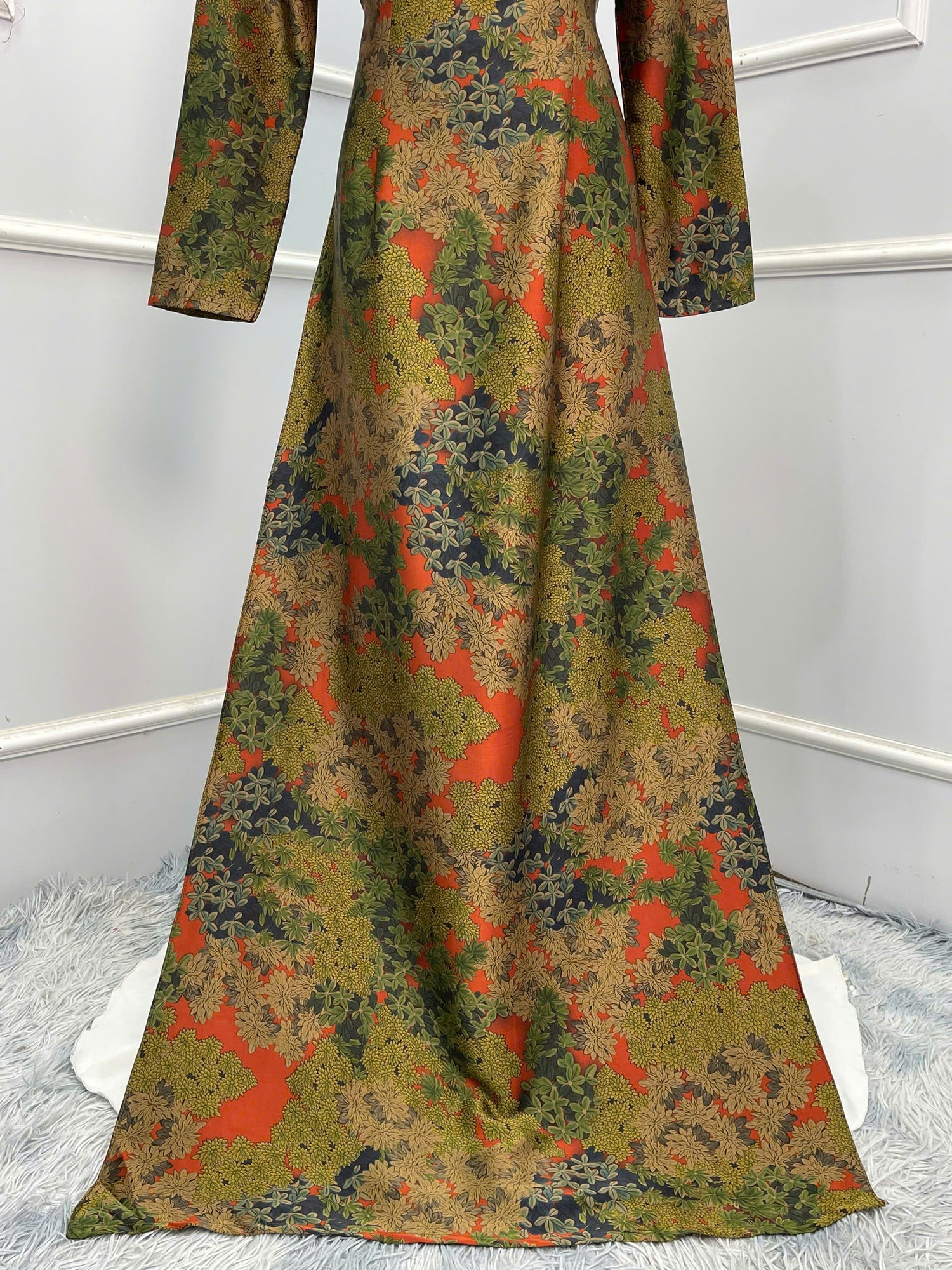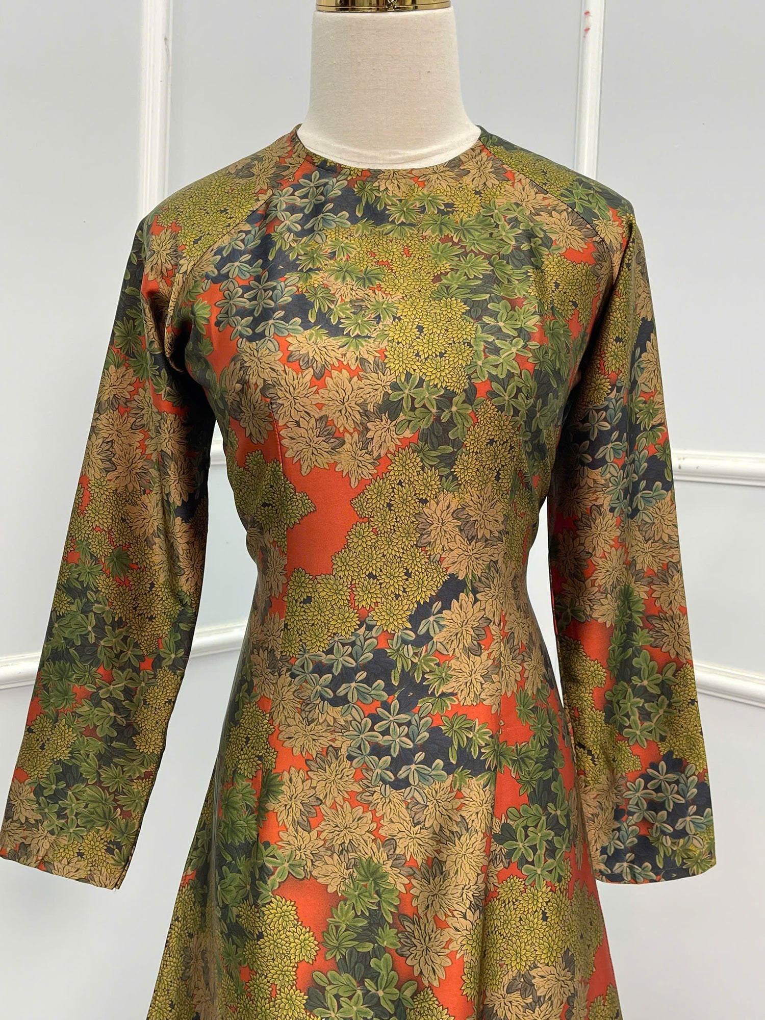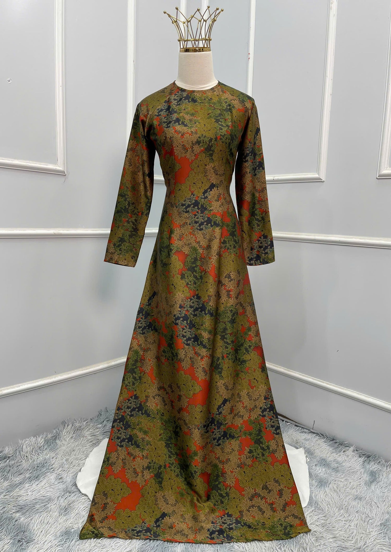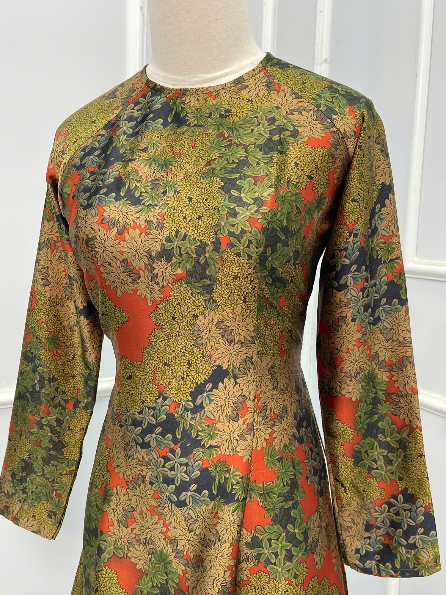 H148 Áo only -Áo dài lụa xanh cam họa tiết hoa