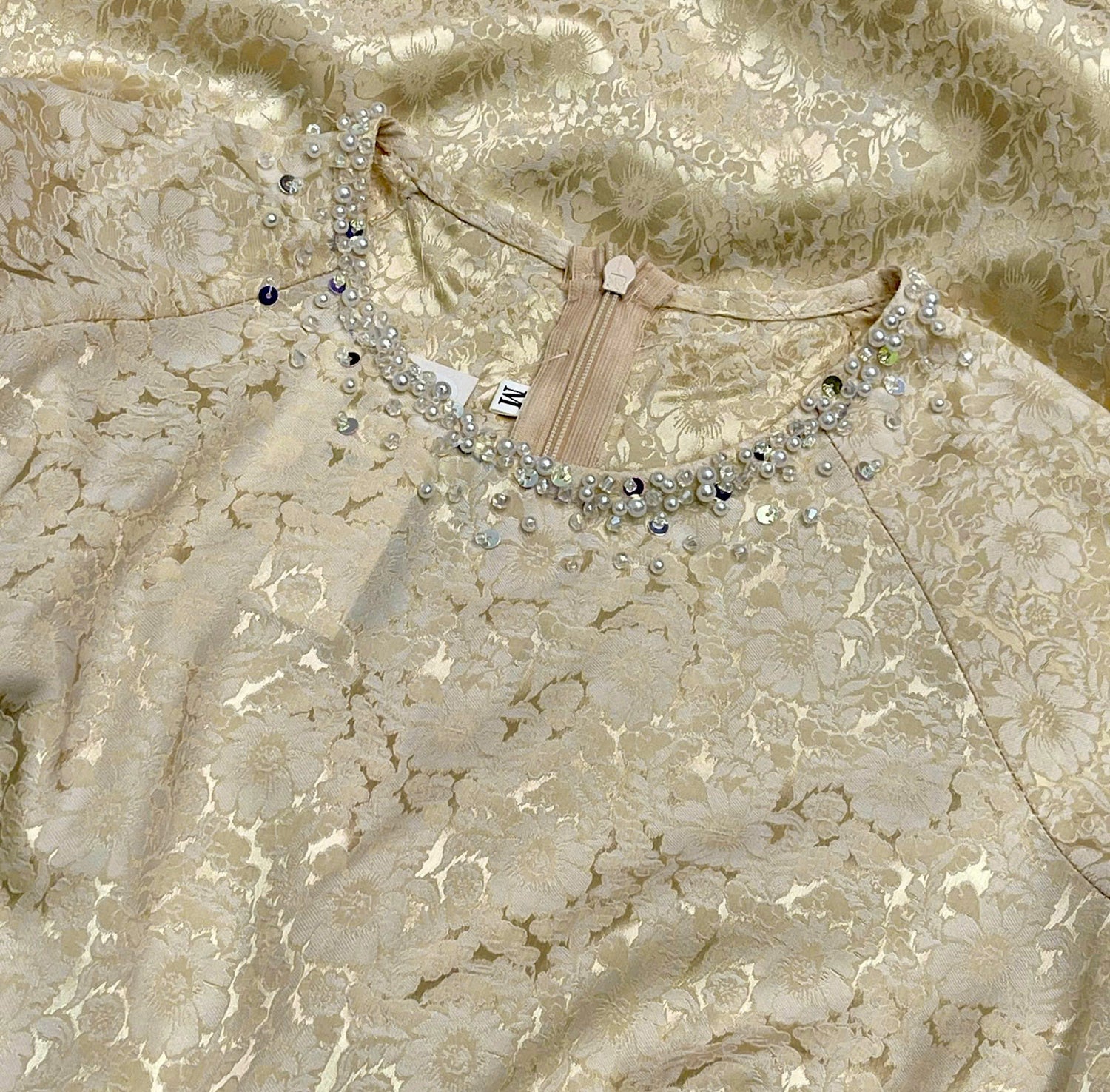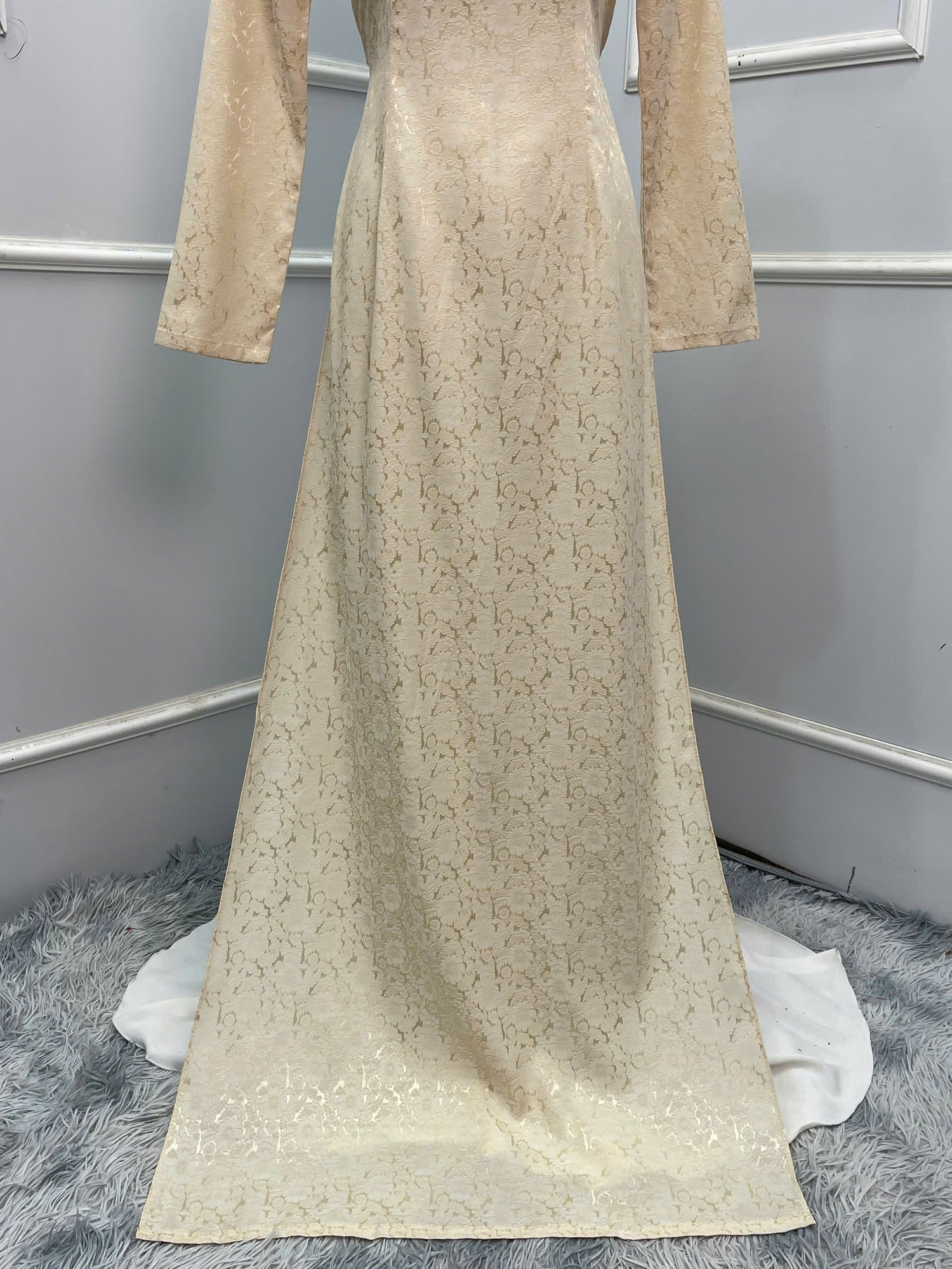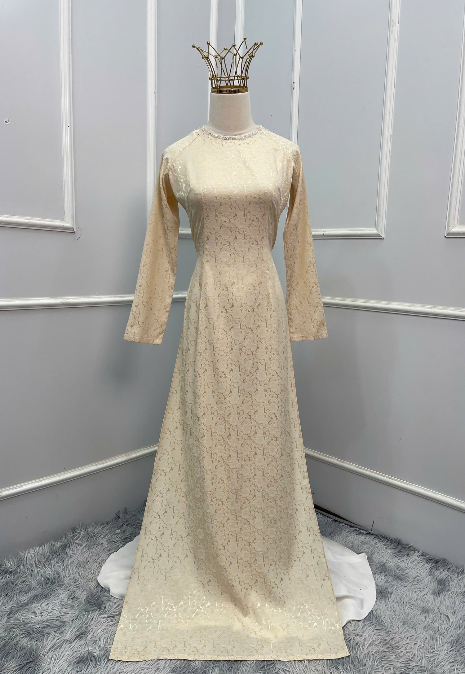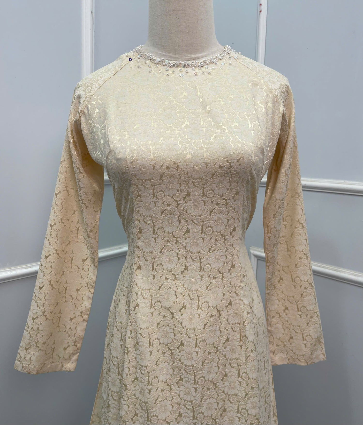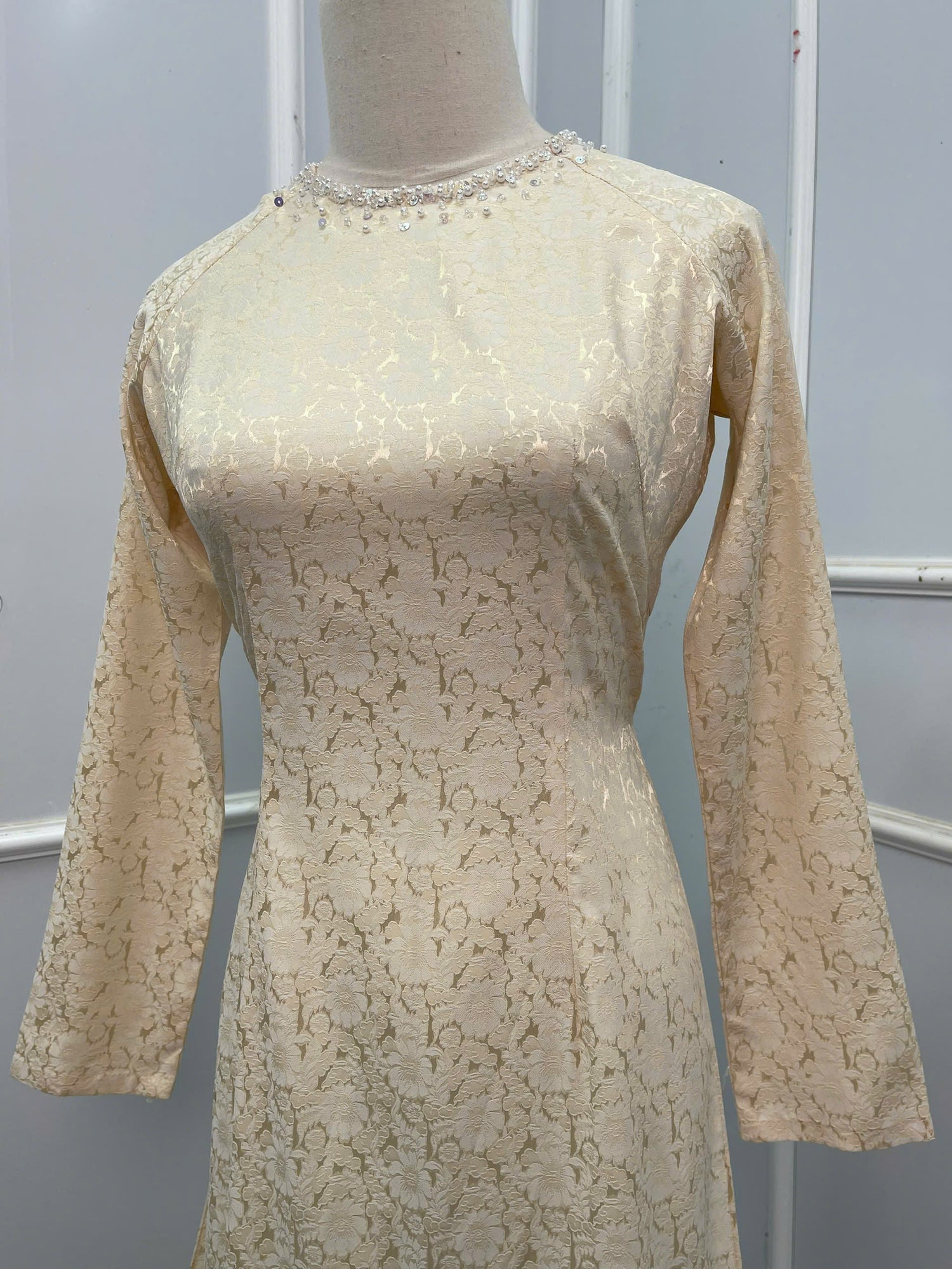 H161 Áo only - Áo dài lụa hoa trà màu be cổ đính