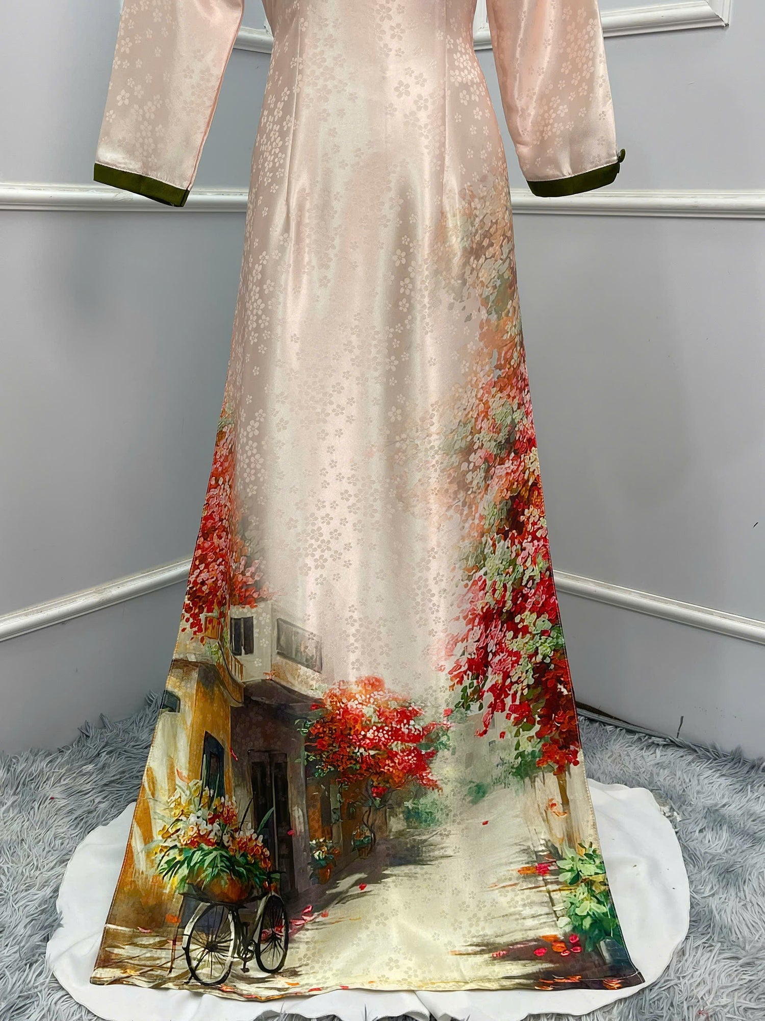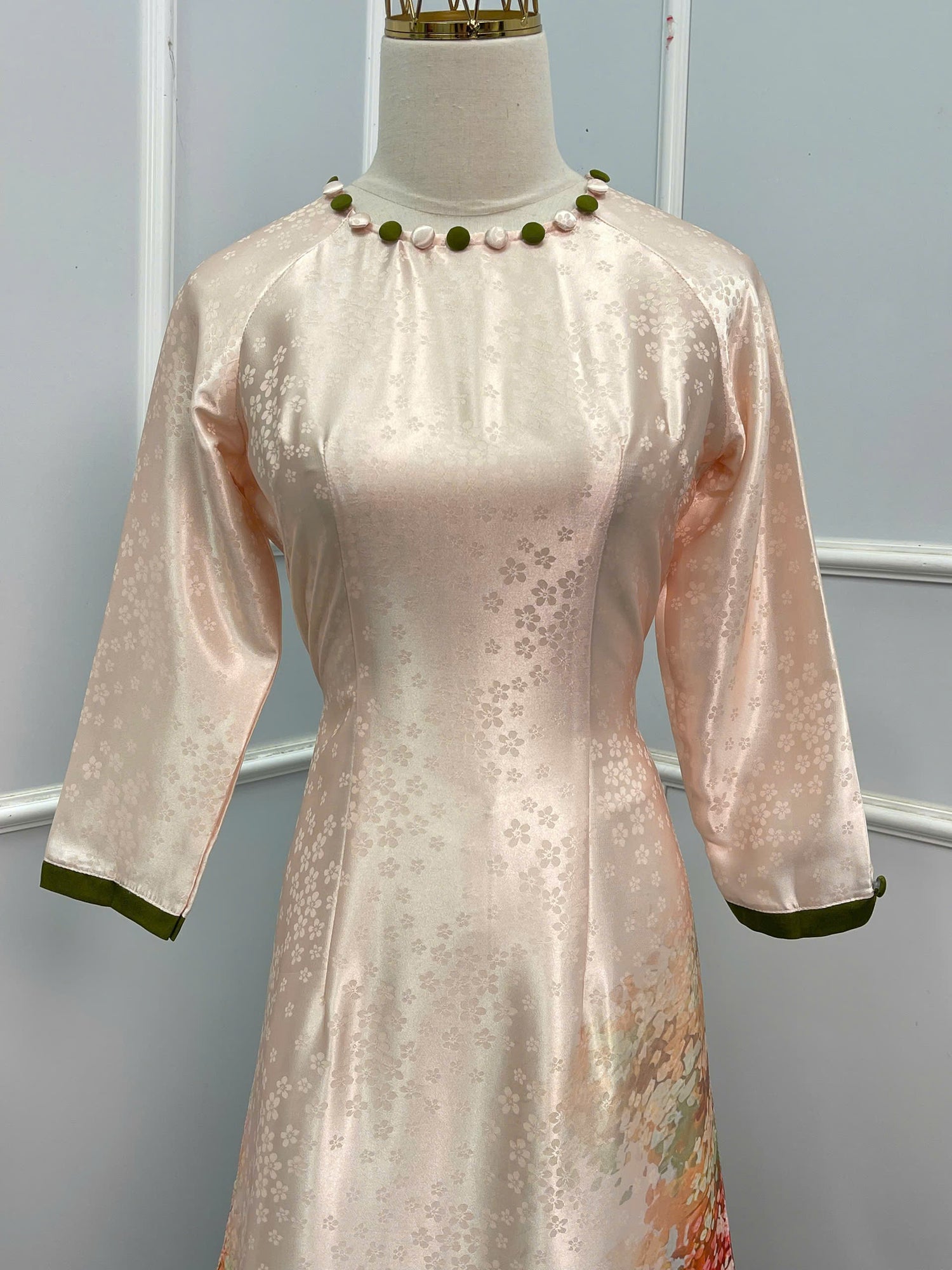H168 Áo only - Áo dài lụa gấm in cổ cúc bọc