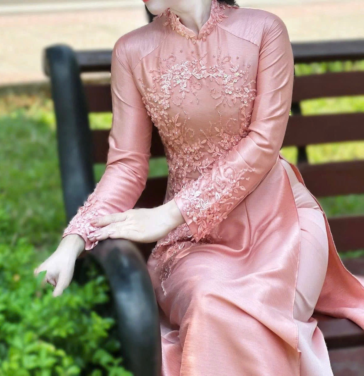H192 Áo only - Áo dài lụa vân gỗ đính hoa màu hồng phấn