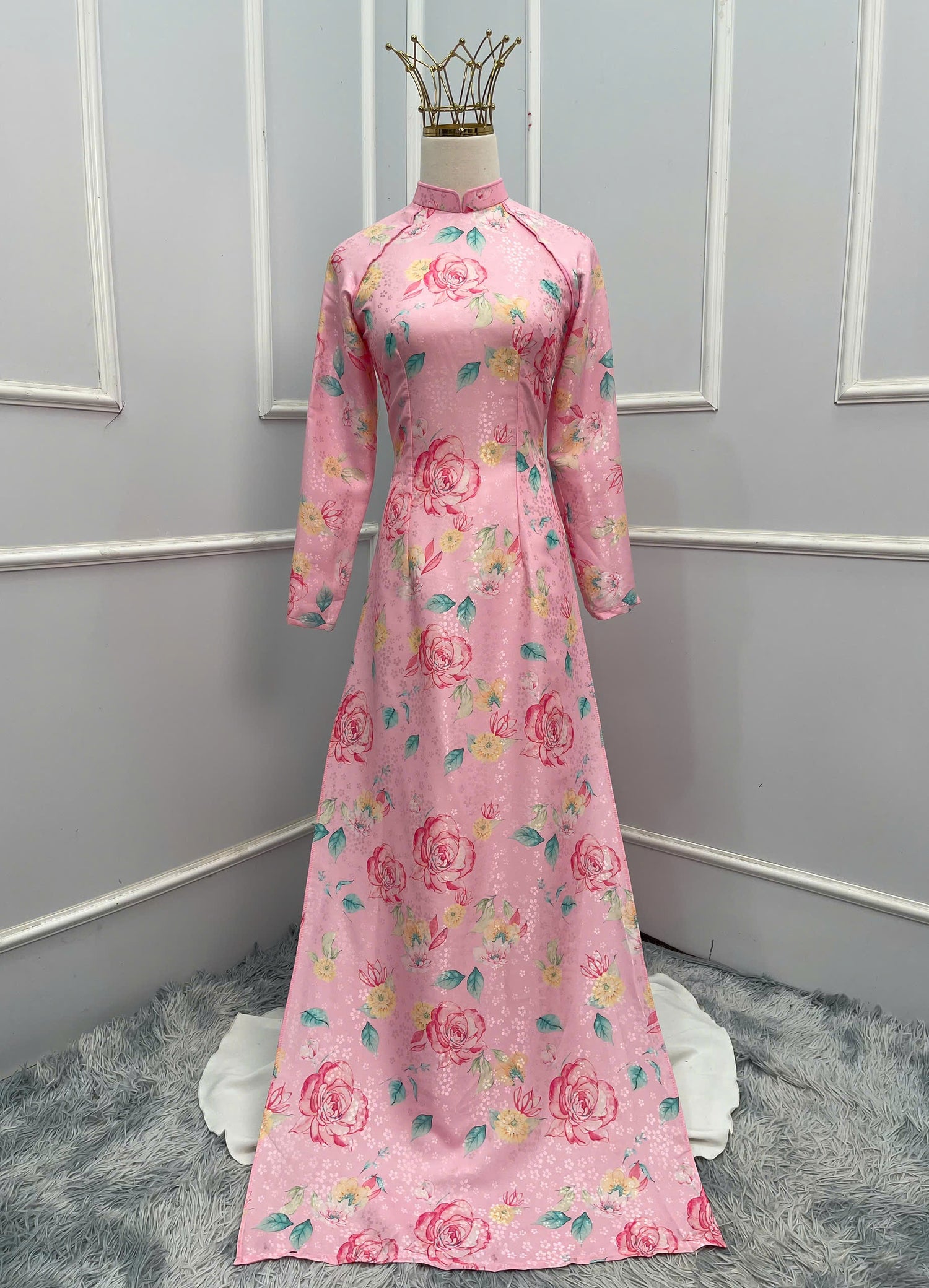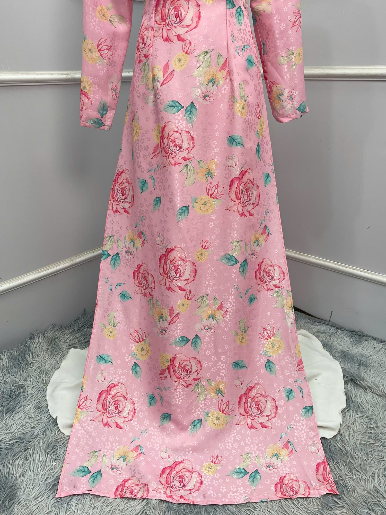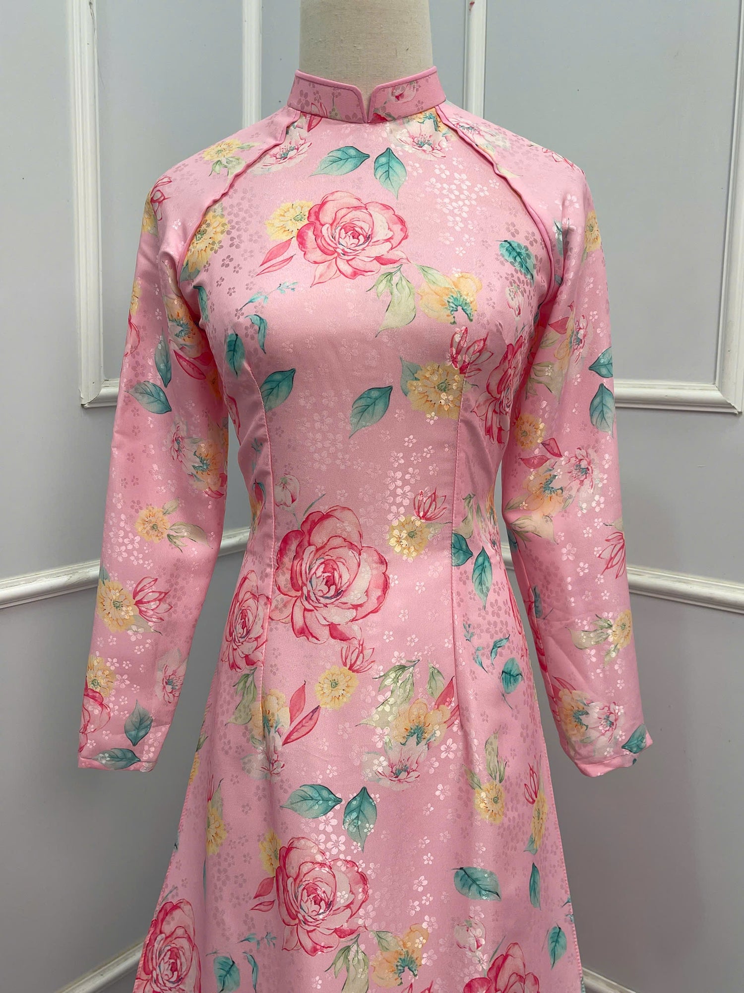 H220 1355 Áo + quần - Áo dài lụa hoa mai màu hồng + quần cùng màu
