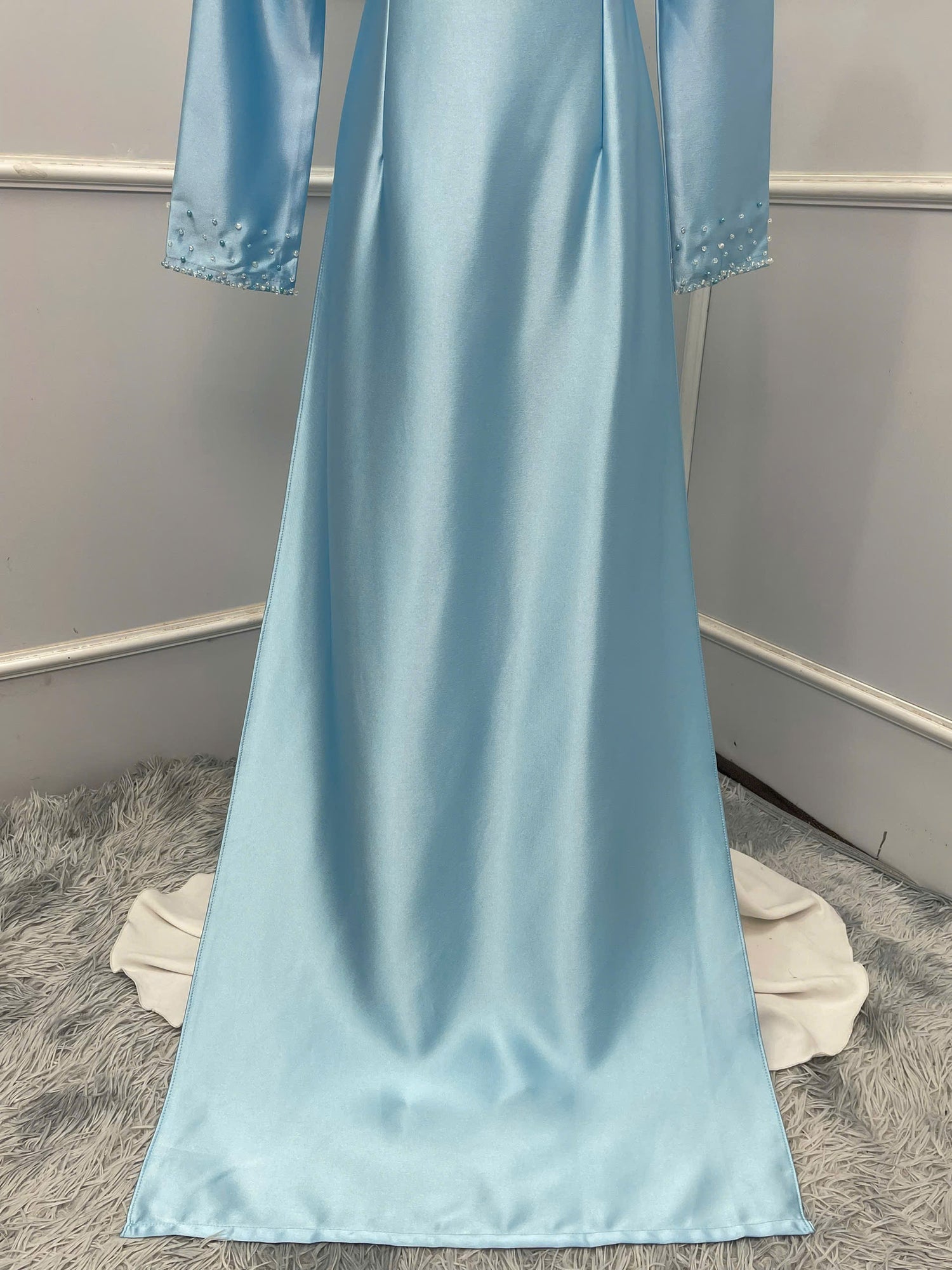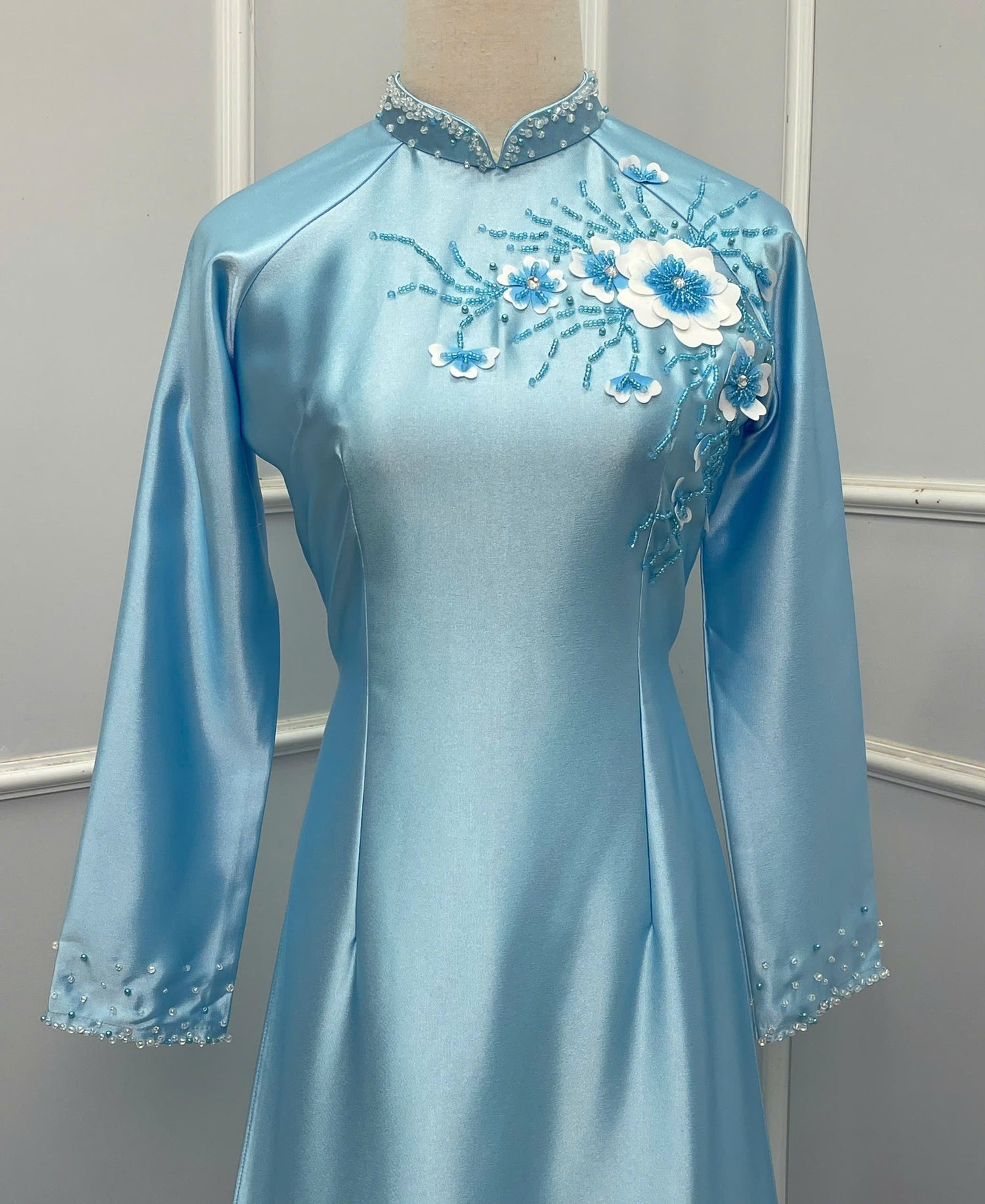 H235 1382 Áo only - Áo dài lụa valentino đính kết màu xanh thiên thanh