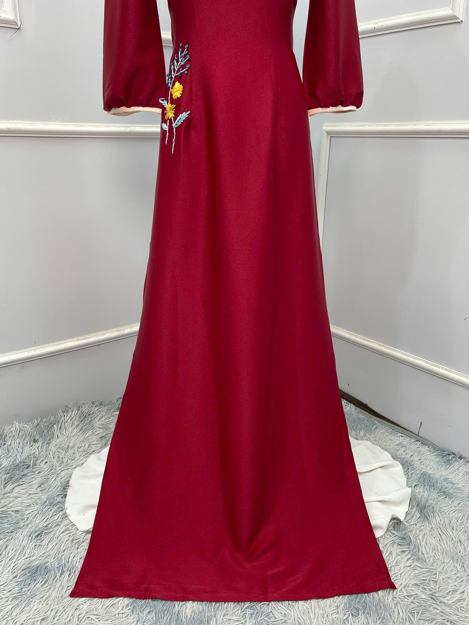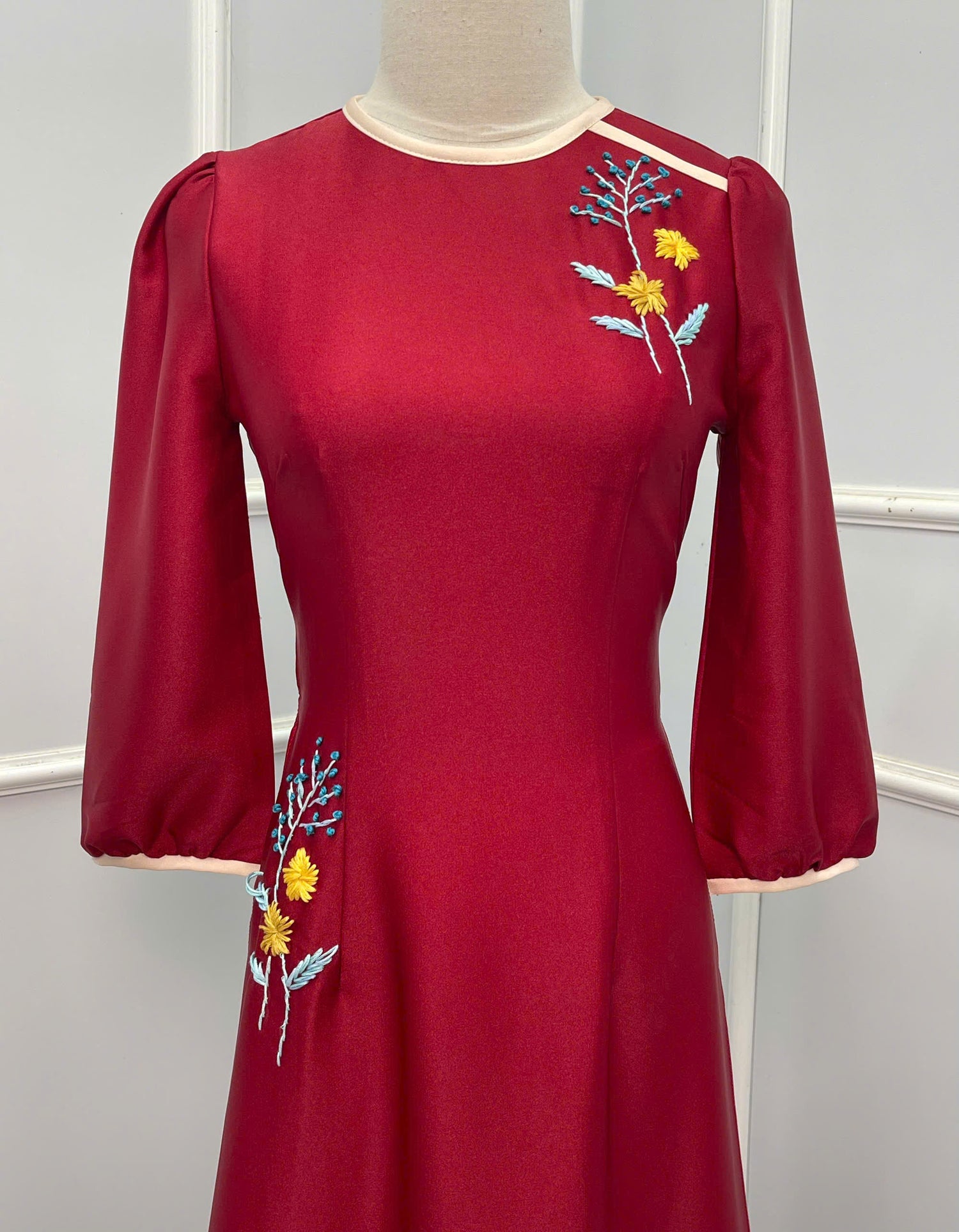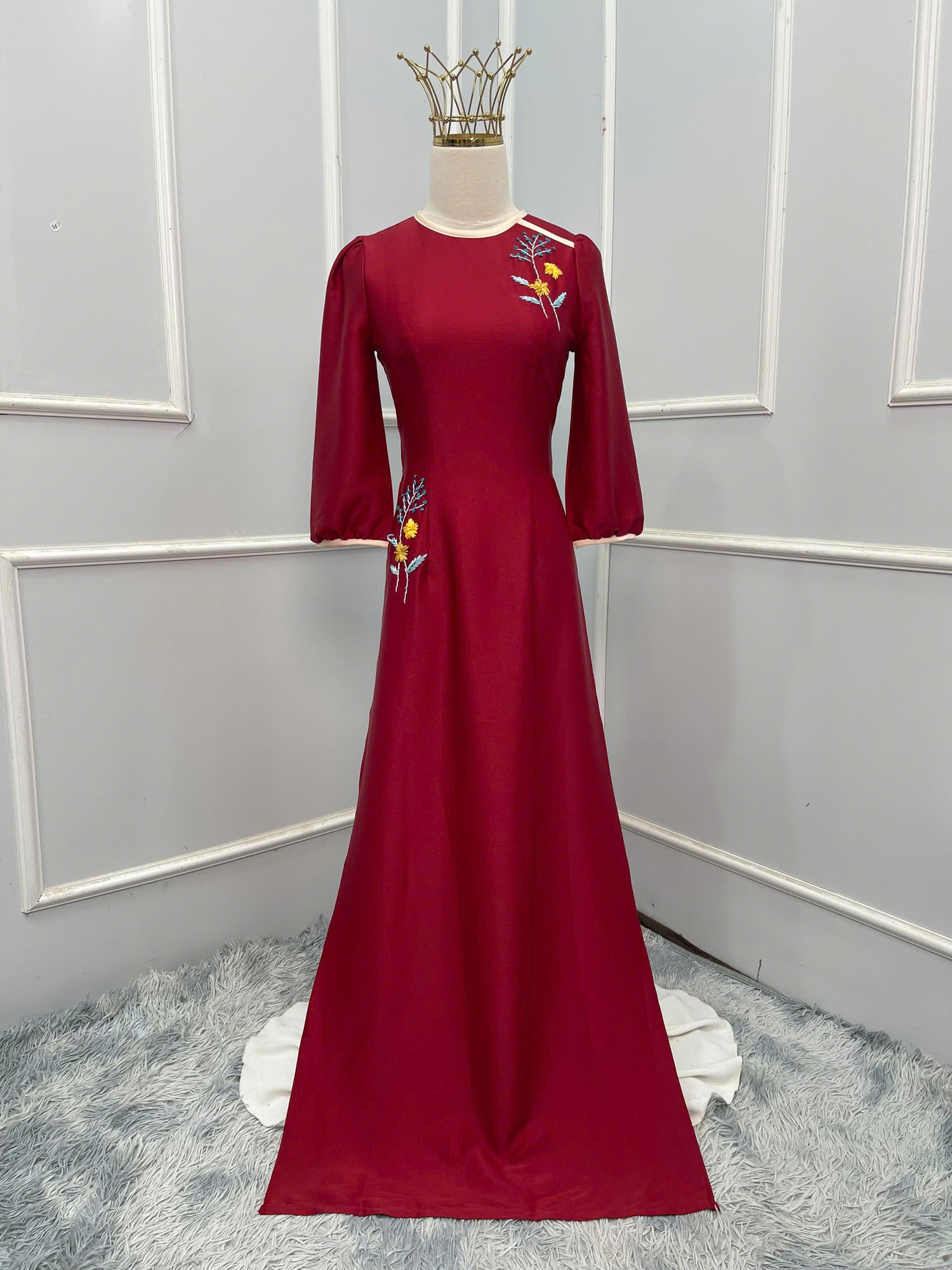 H255 1401 Áo + quần - Áo dài lụa thêu tay màu đỏ + quần kem
