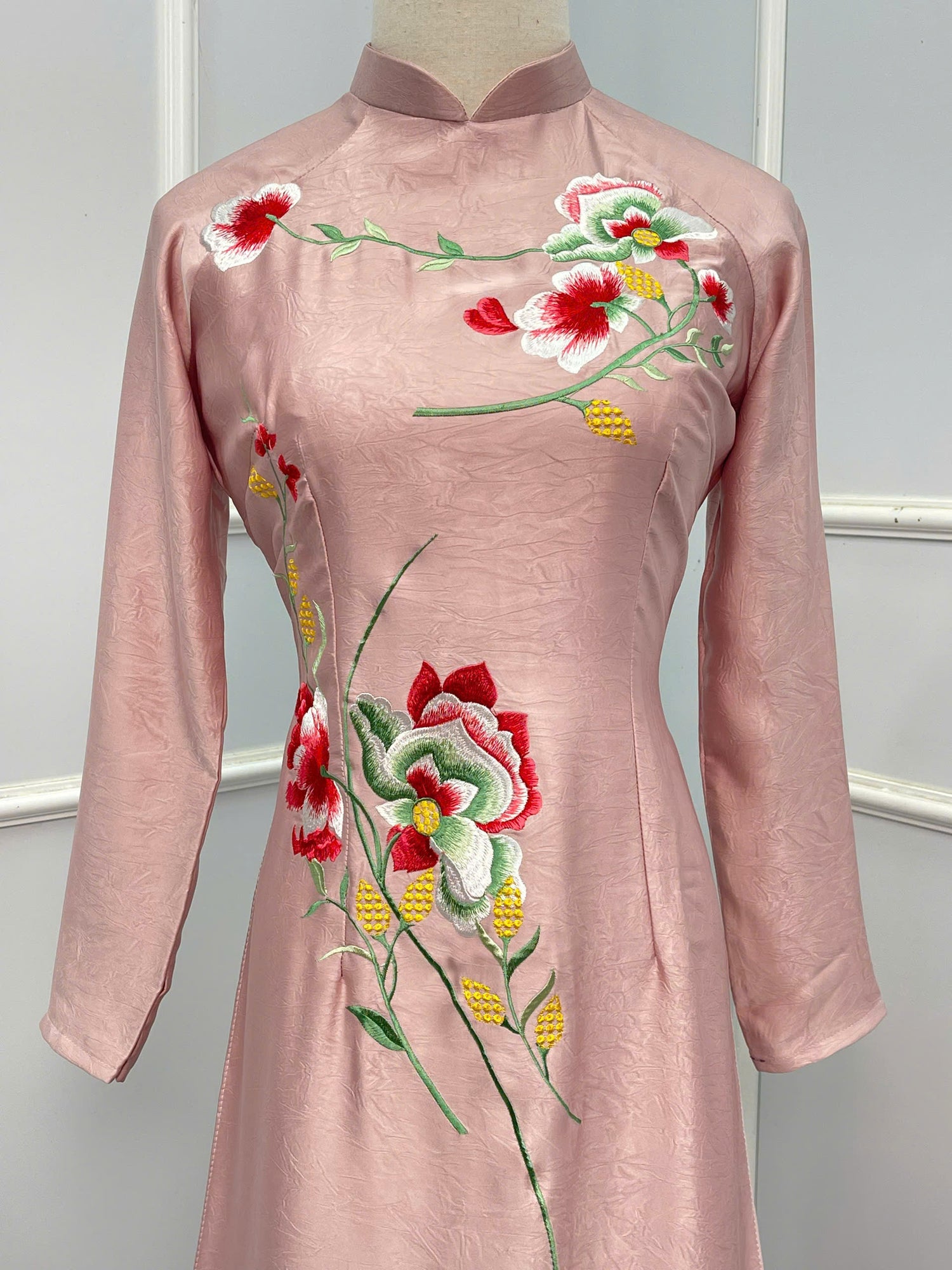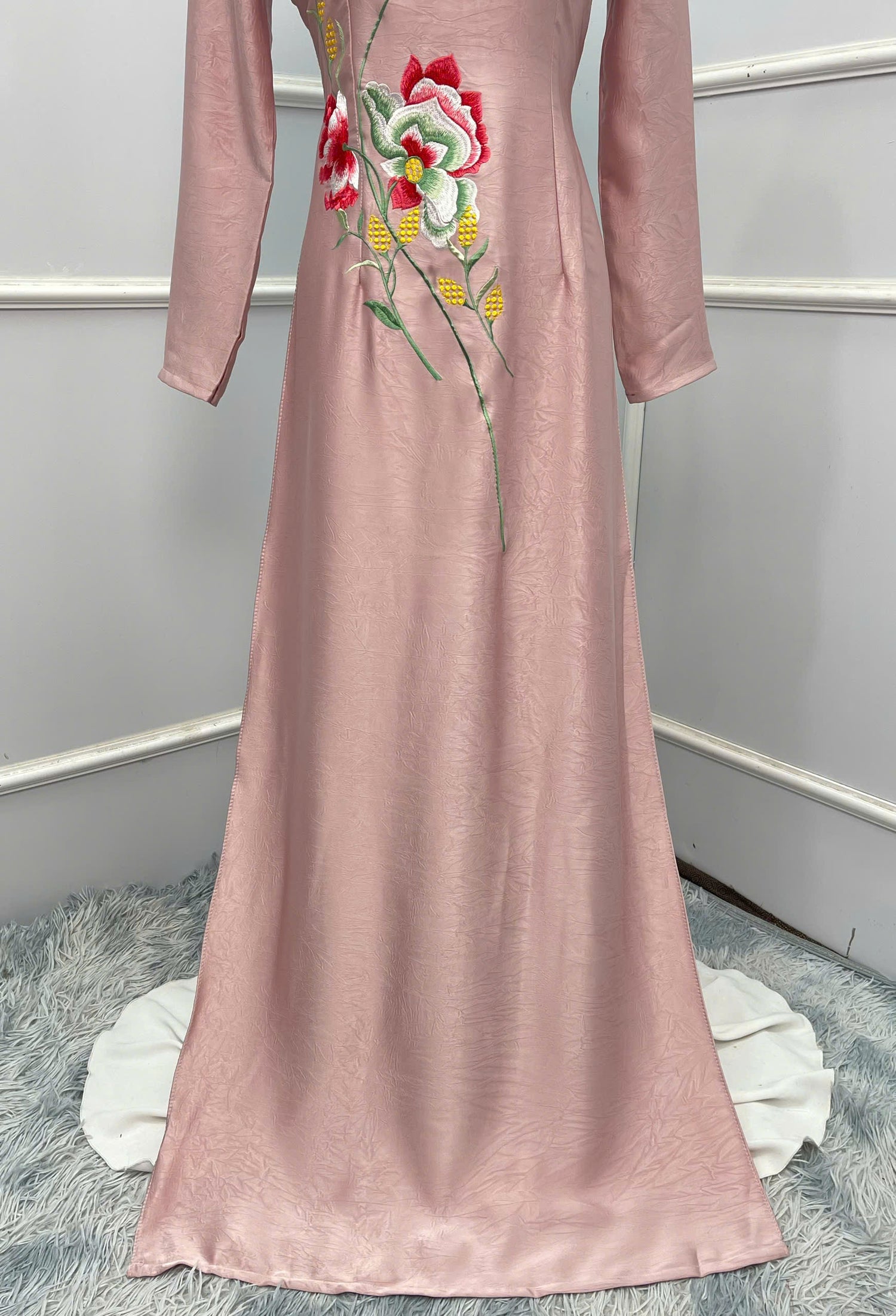 H257 1404 Áo dài lụa hà lan thêu hoa + quần cùng chất