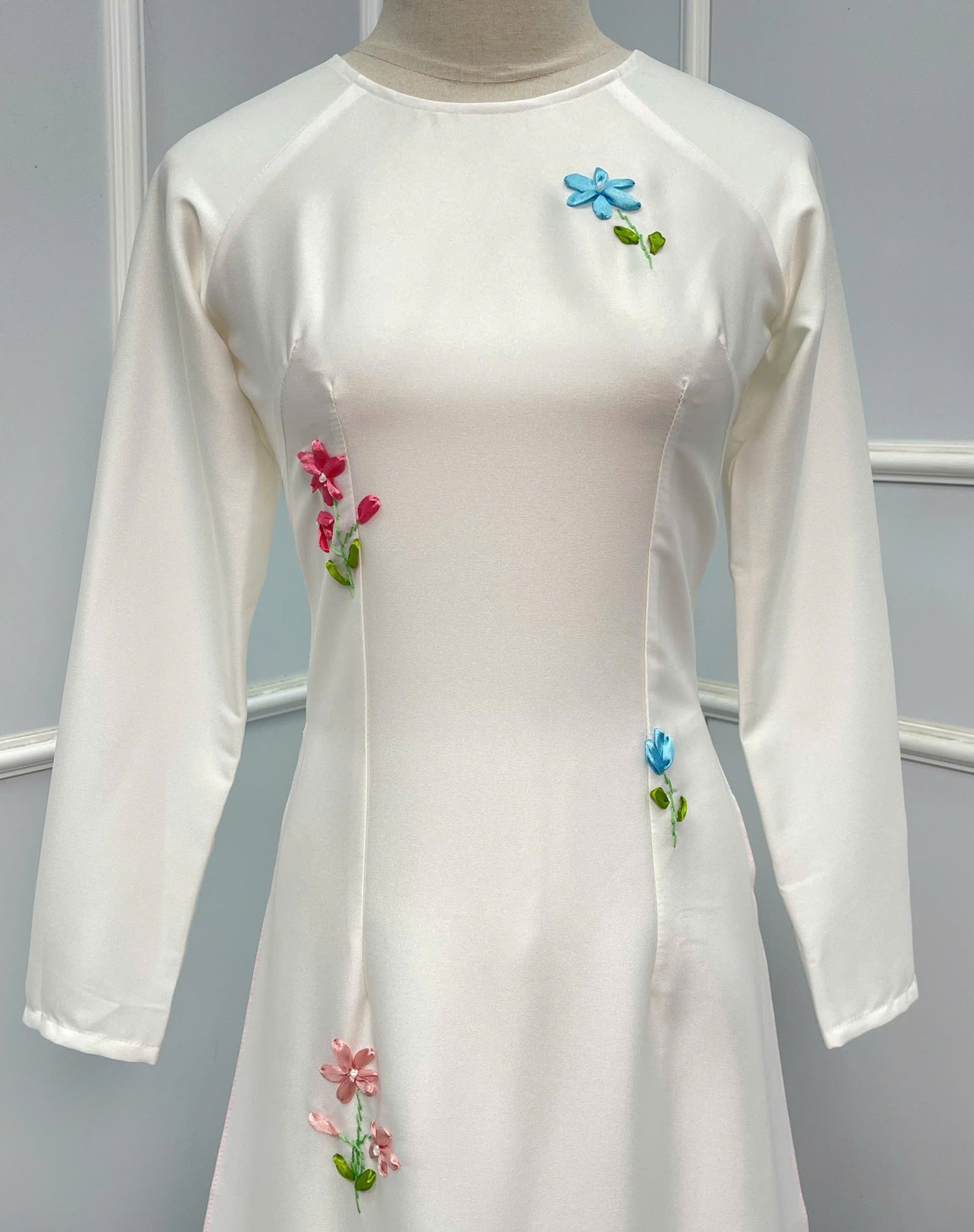 H261 1407 Áo only - Áo dài lụa valentino trắng thêu hoa