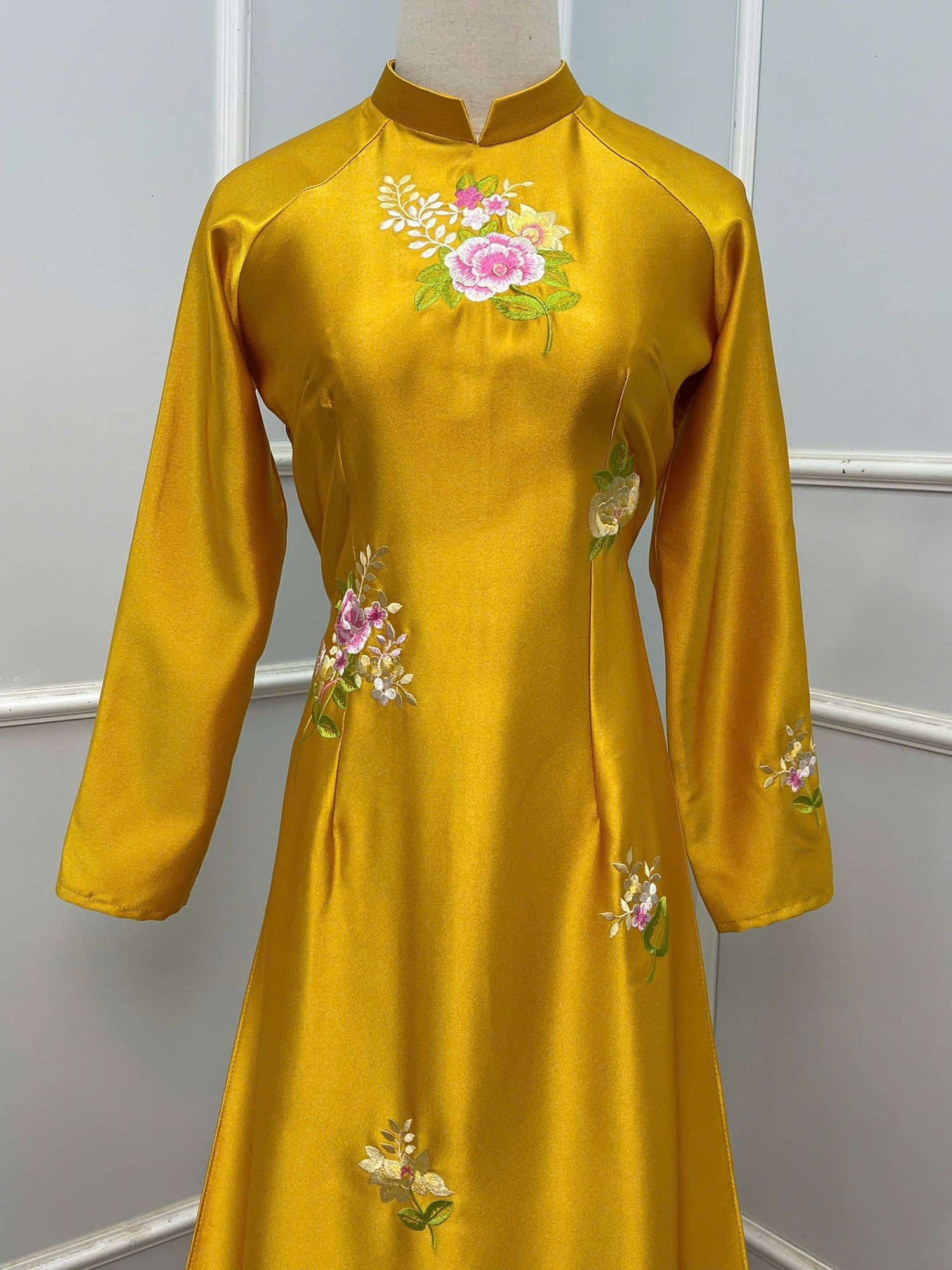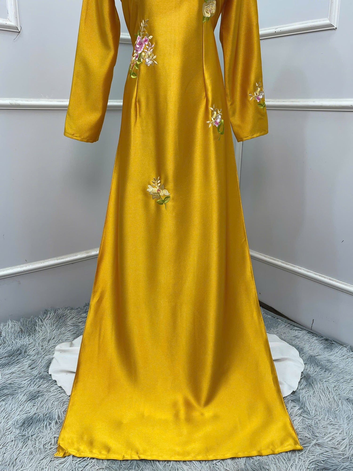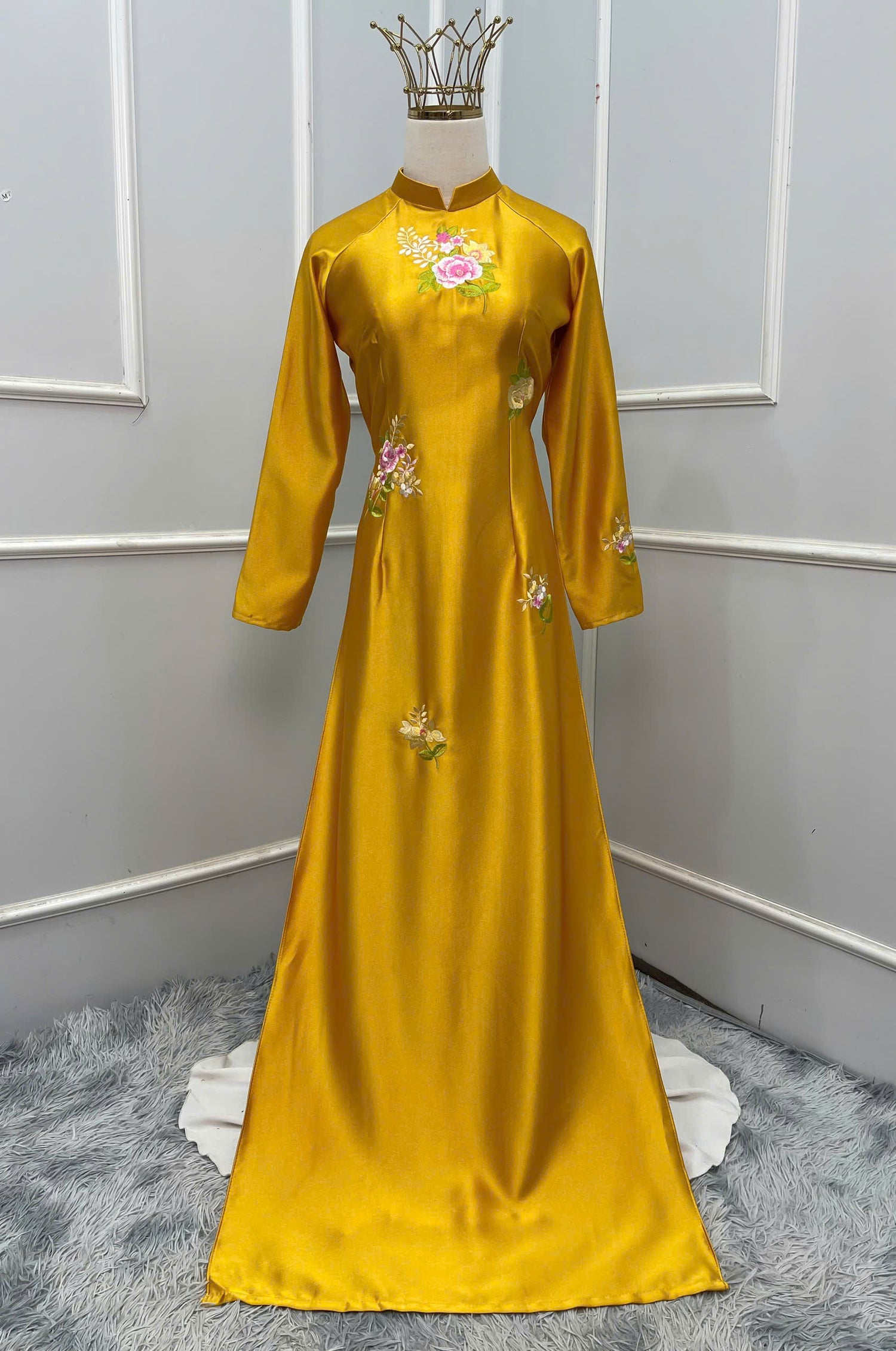 H292 1483 Áo only - Áo dài lụa valentino thêu hoa màu vàng