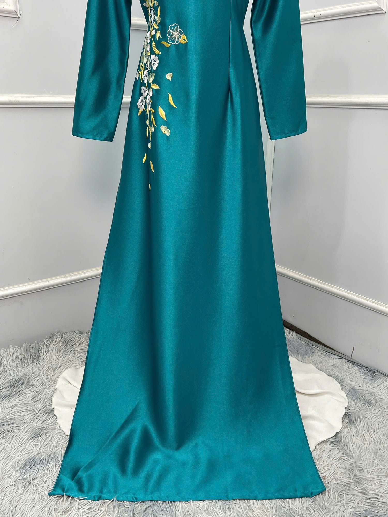 H294 1485 Áo only - Áo dài lụa valenino thêu hoa màu xanh chai
