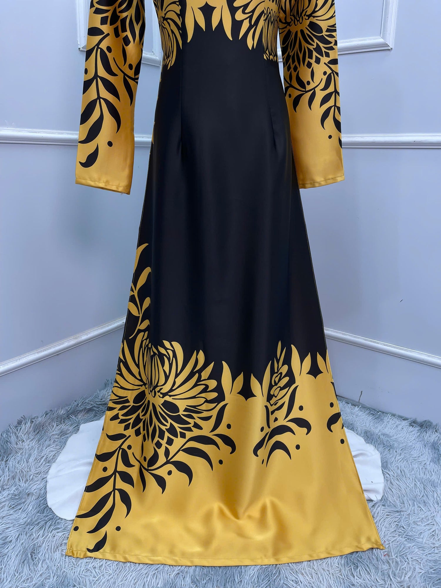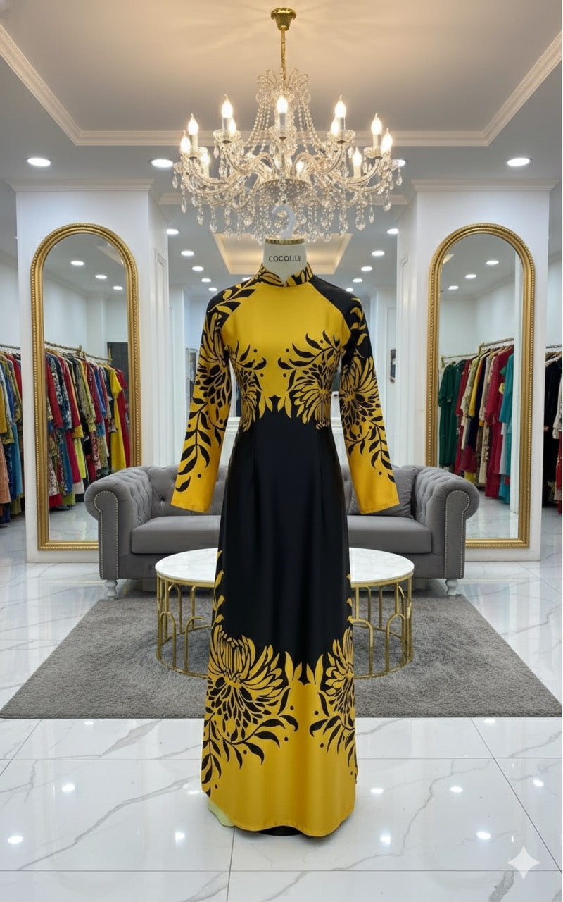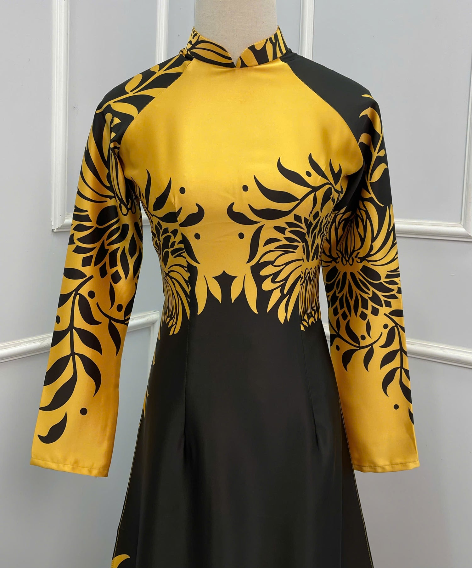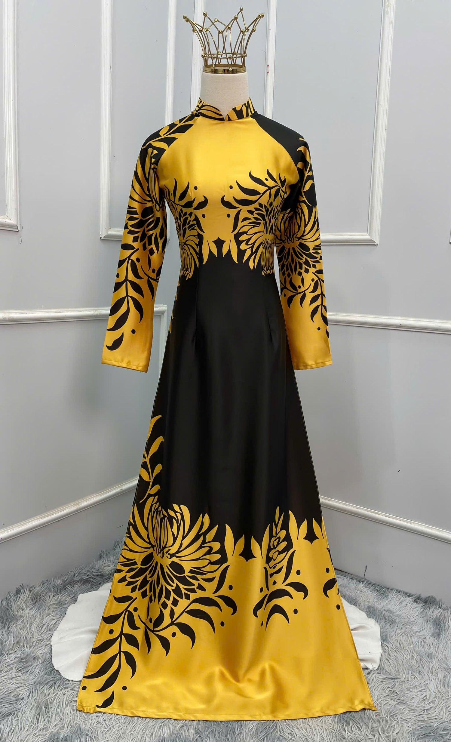 H308 1521 Áo only - Áo dài lụa ánh sao thiết kế 2 da màu vàng đen