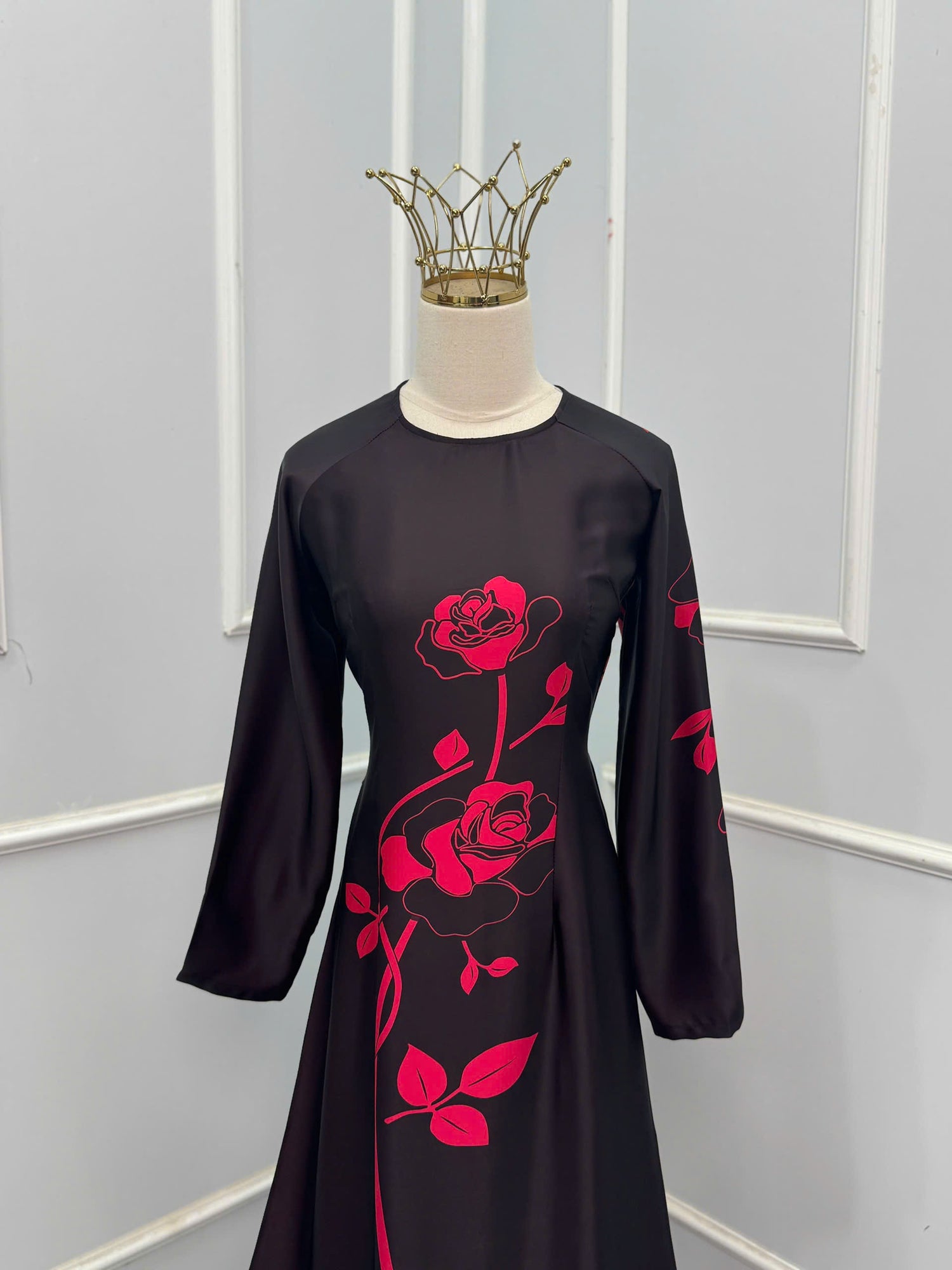 H332 Áo only - Áo dài lụa ánh sao 2 da màu đen hoa hồng