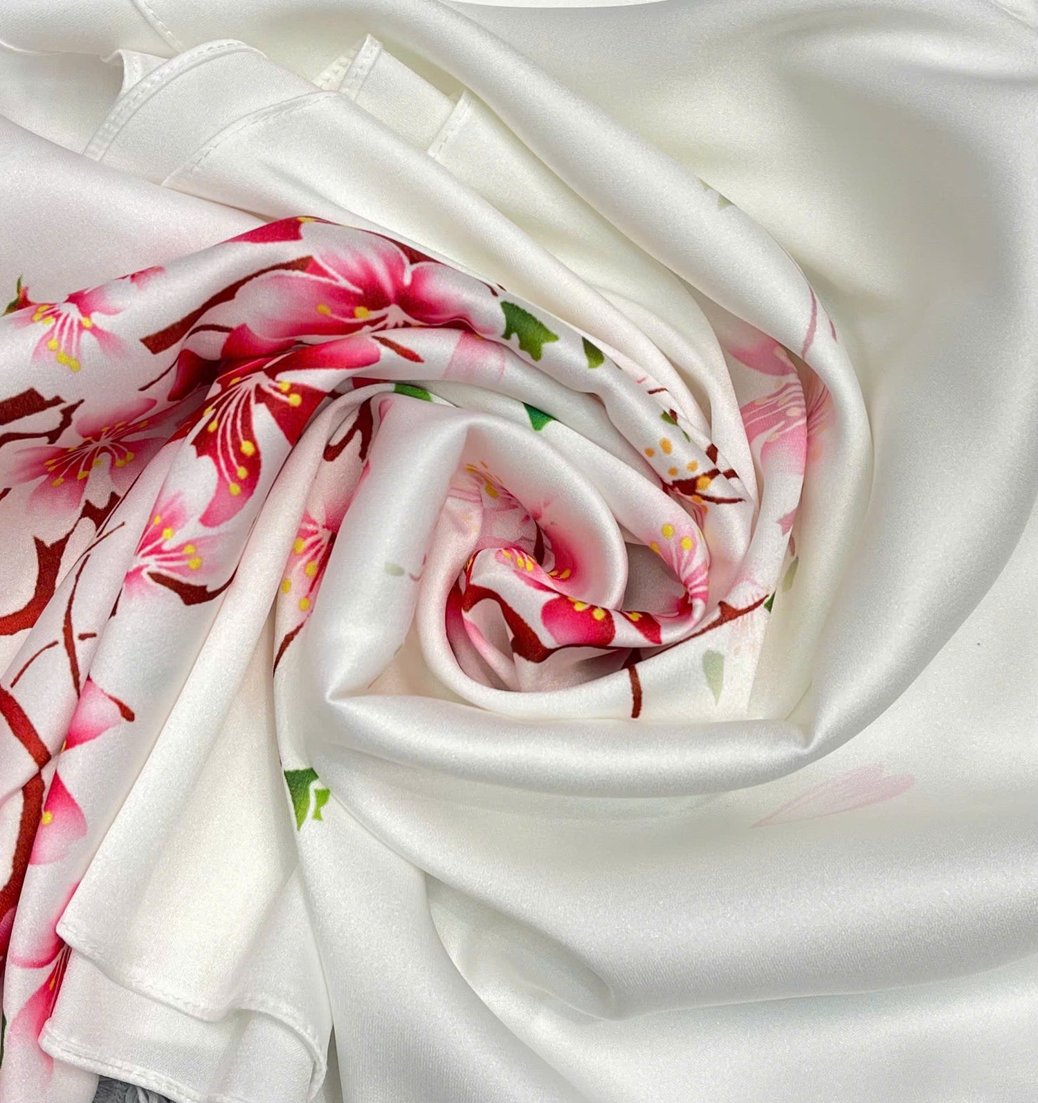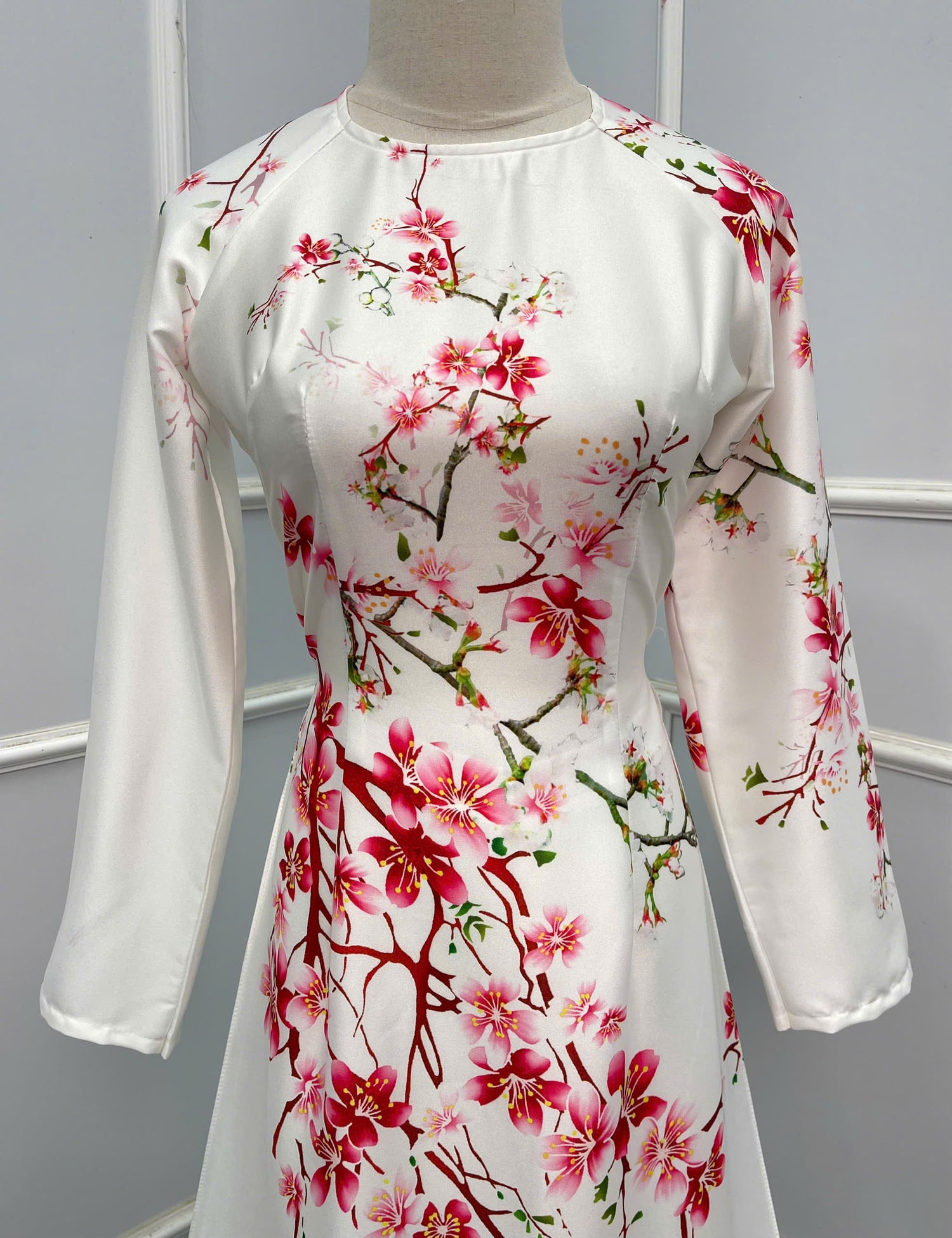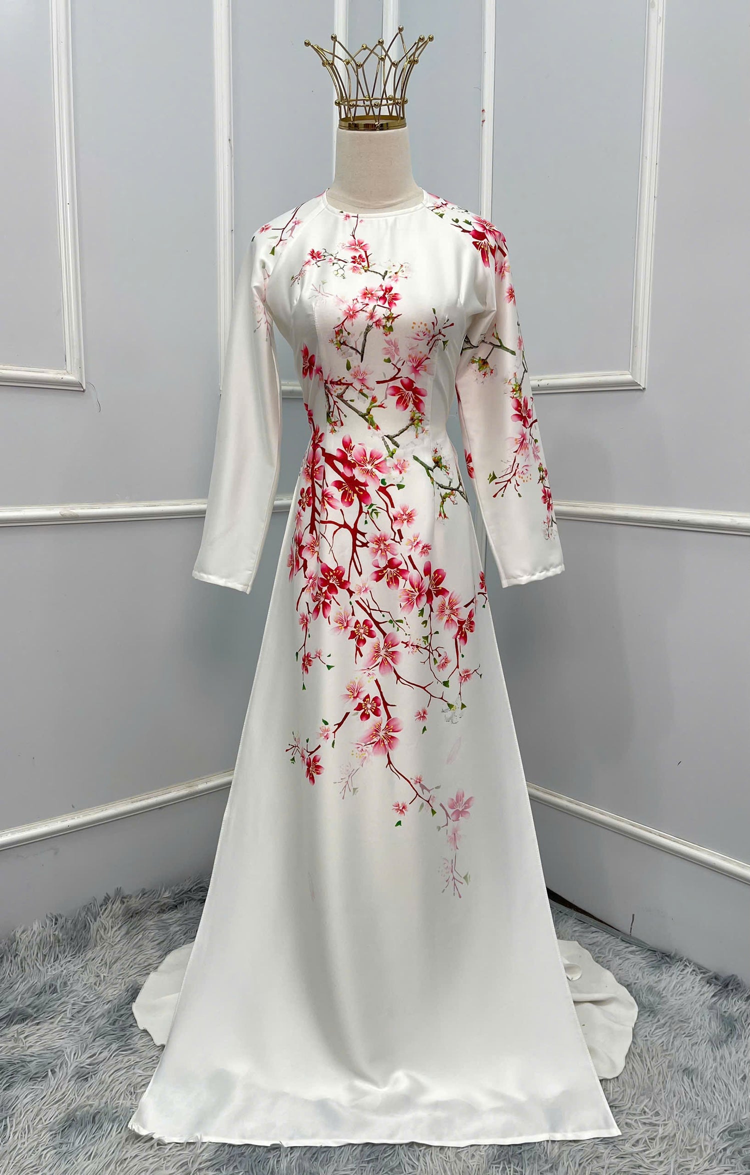 H399 1693 Áo only - Áo dài lụa ánh sao thiết màu trắng hoa đào