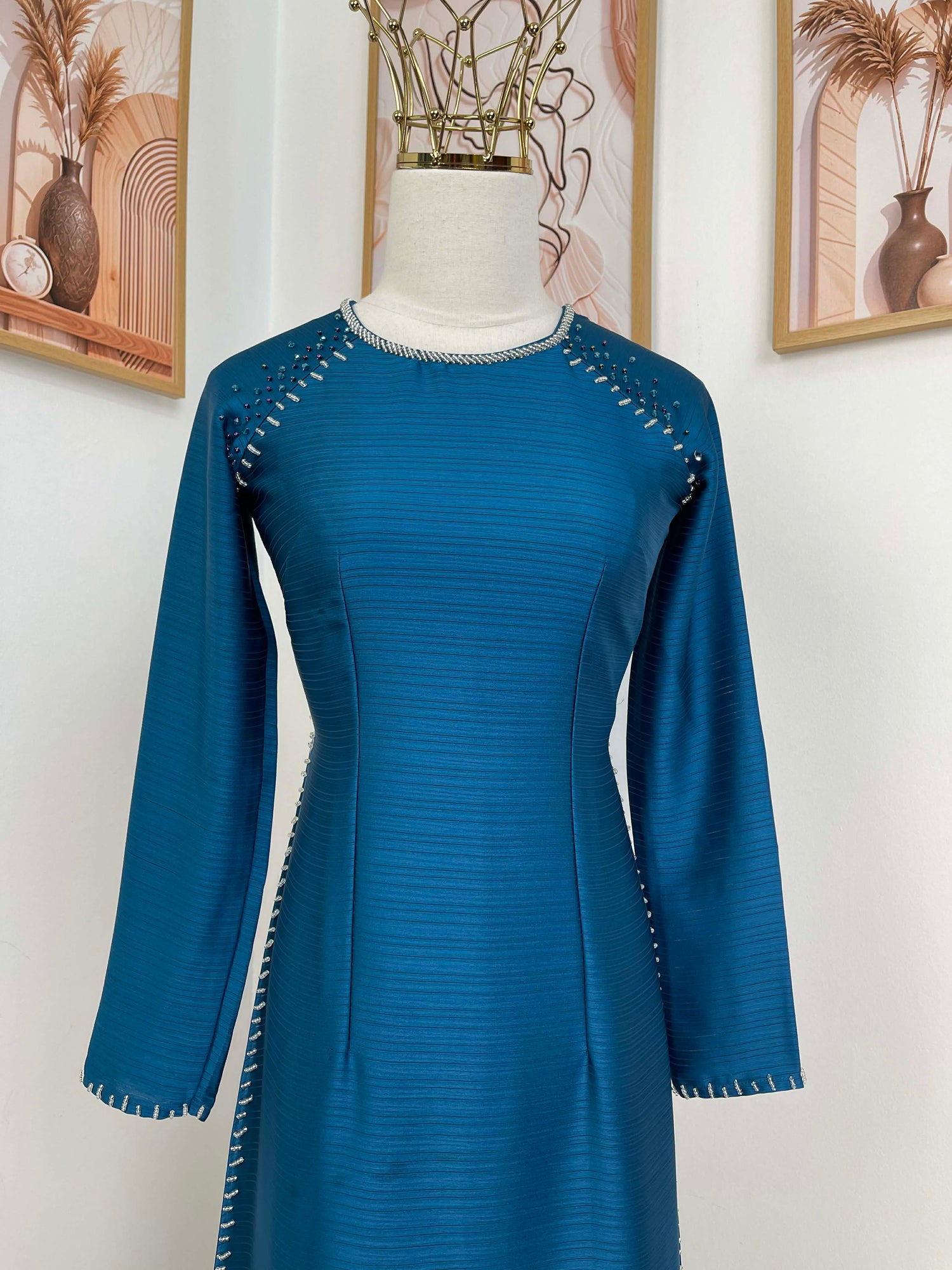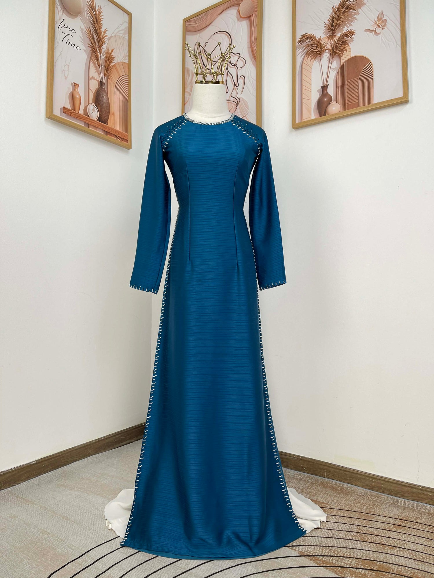 H430 1775 Áo only - Áo dài lụa ánh nguyệt 4 tà đính kết màu xanh dương
