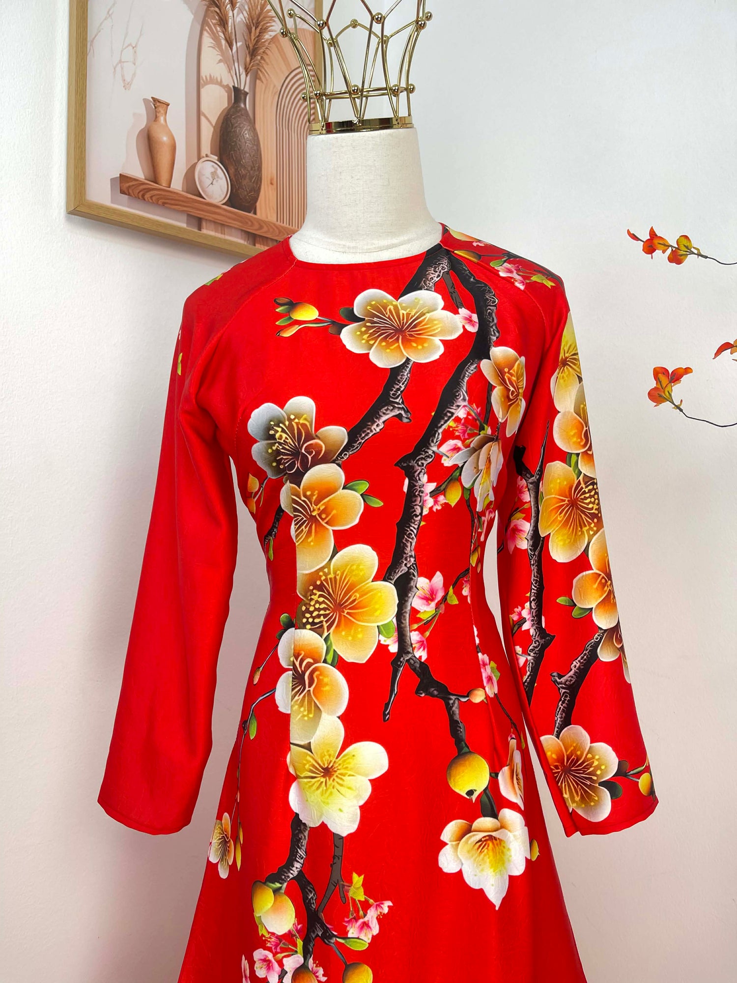 H484 1964 Áo only - Áo dài Tết lụa ánh sao màu đỏ tươi hoa mai