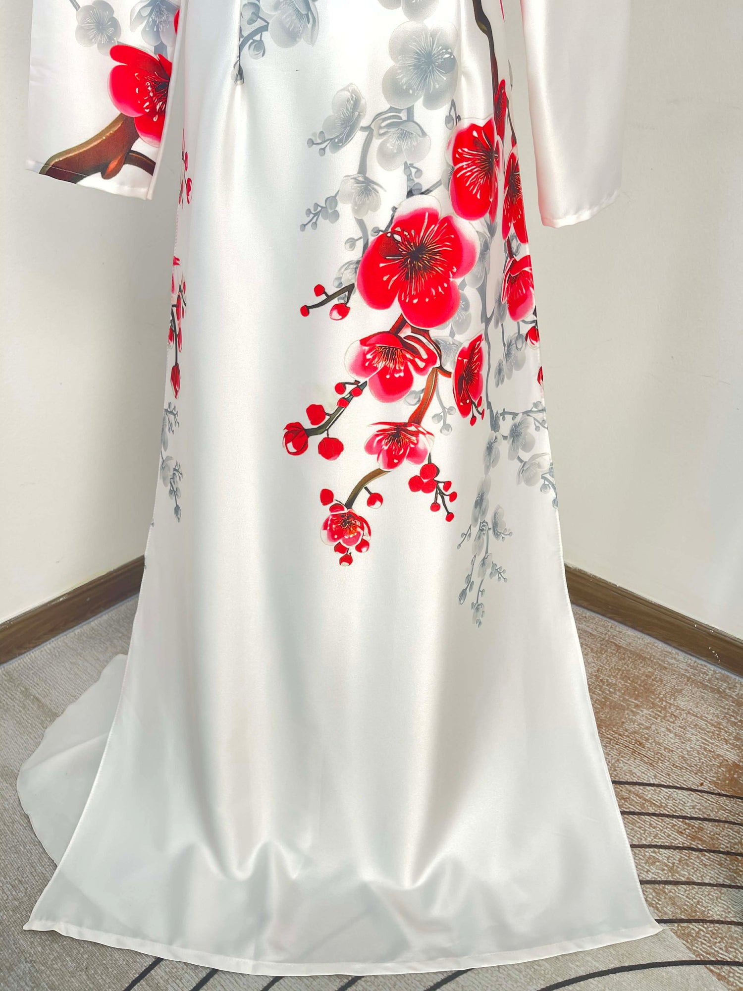 H488 1968 Áo only - Áo dài Tết lụa ánh sao màu trắng hoa đỏ