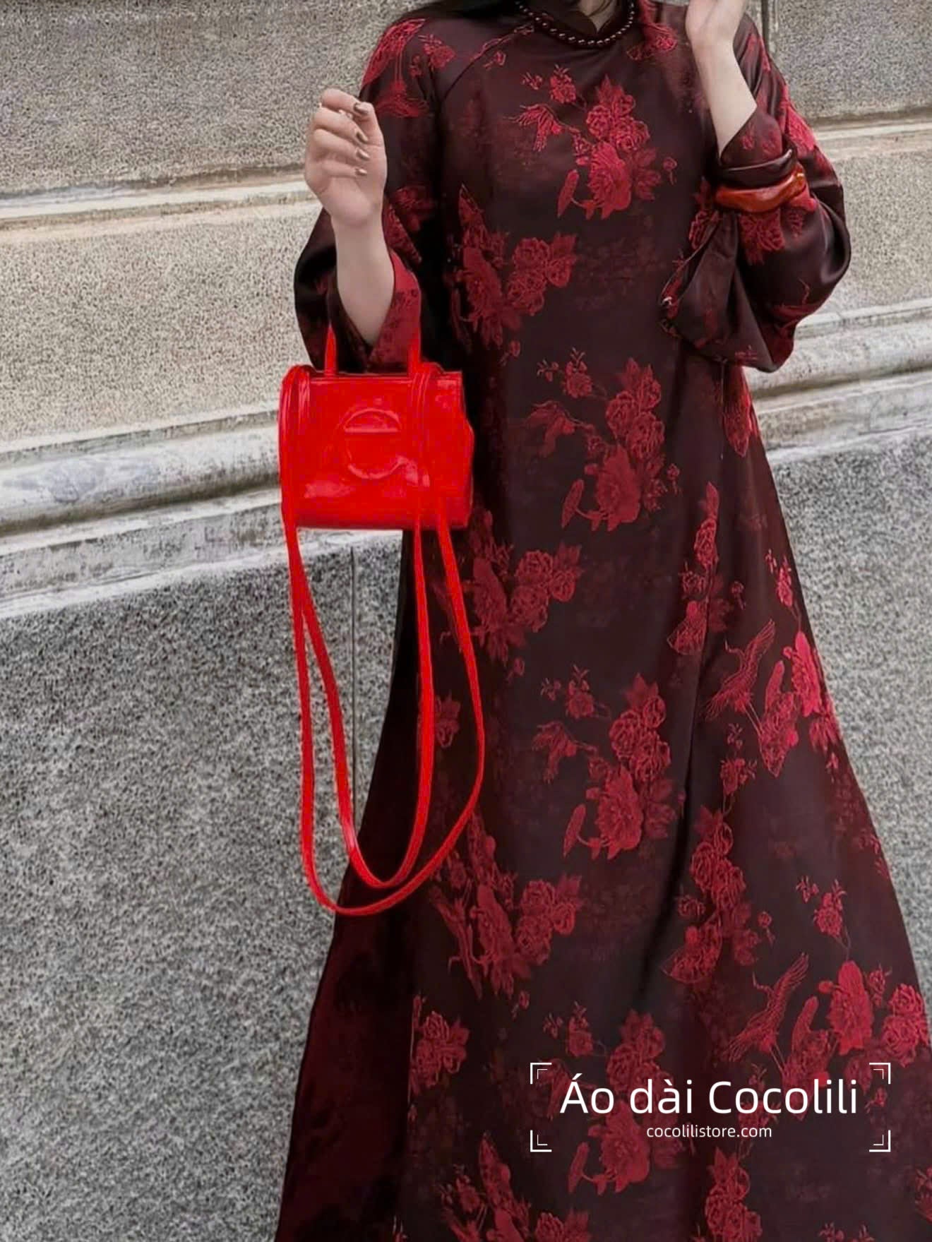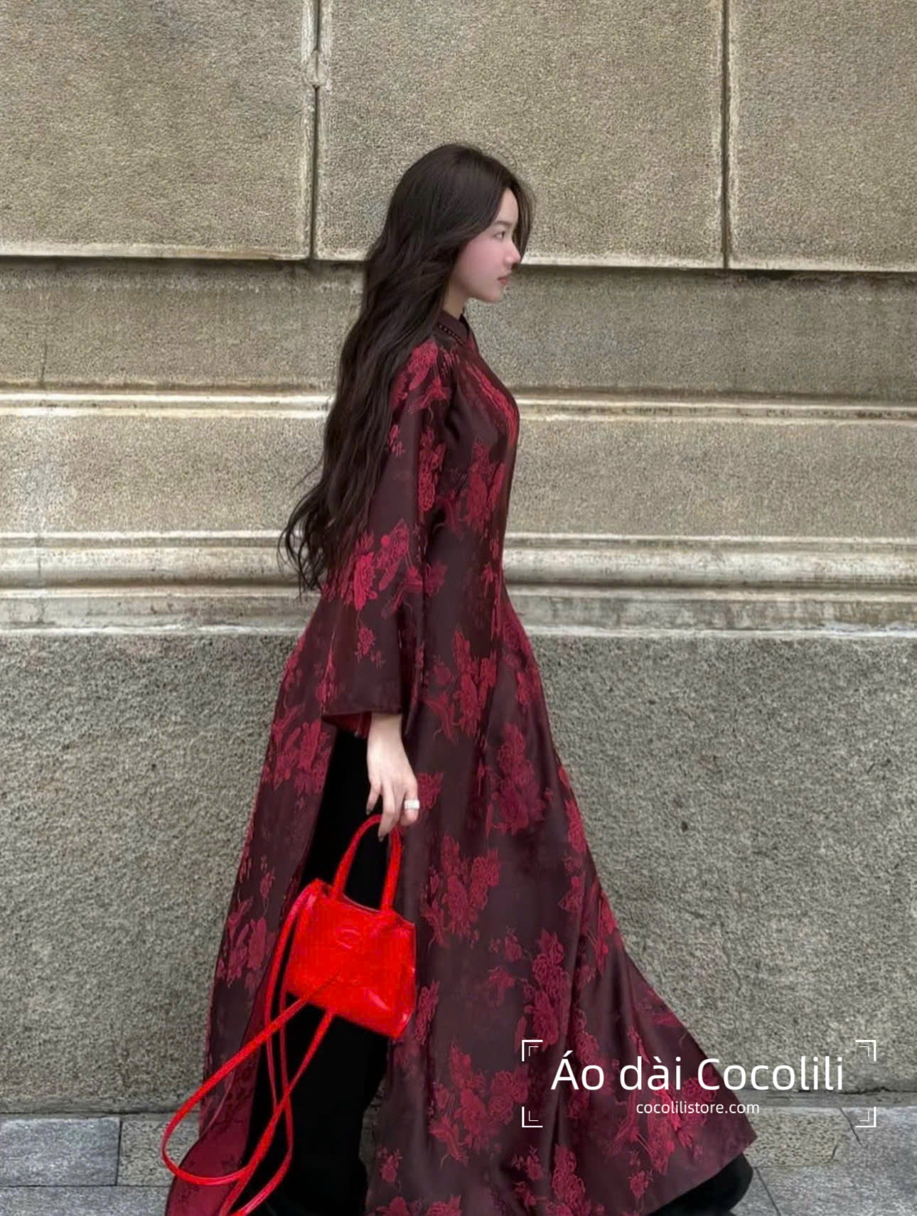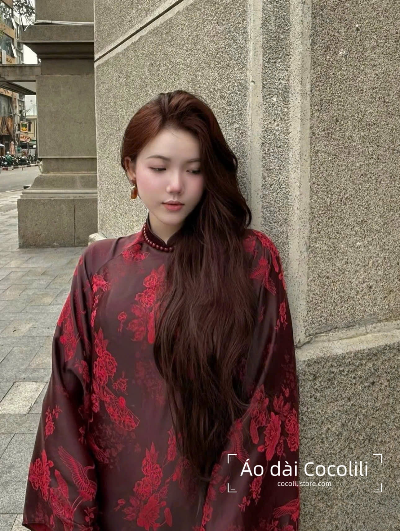 H560 Áo only - Áo dài dáng suông 2 tà lụa gấm màu đỏ đậm đính cổ