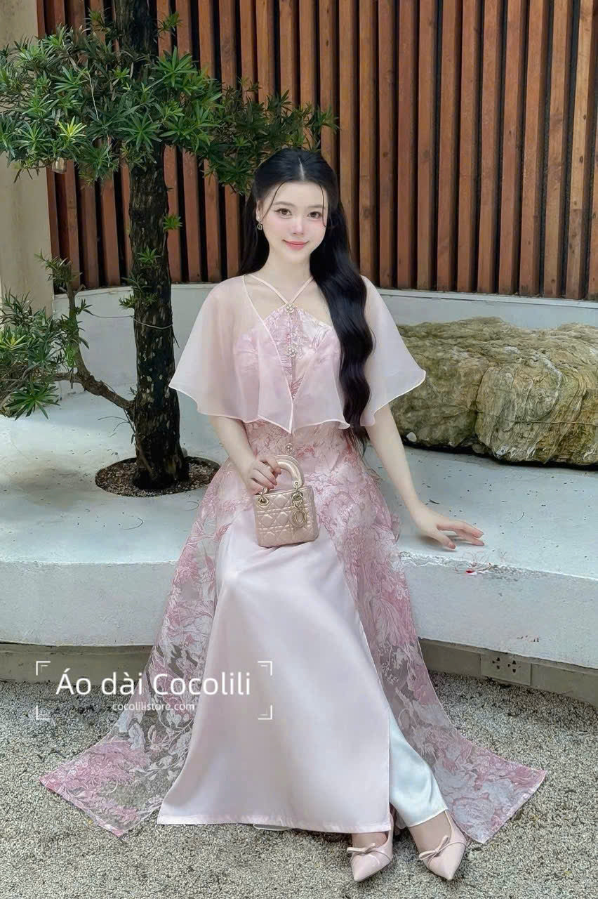 H616 Áo only no pants - Áo dài cách tân kèm choàng màu hồng phấn