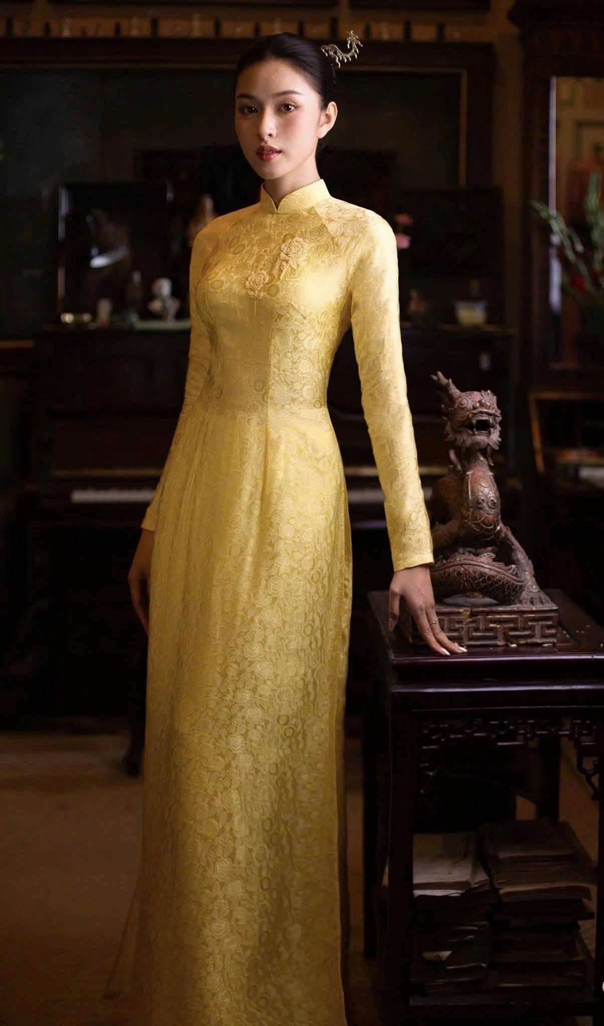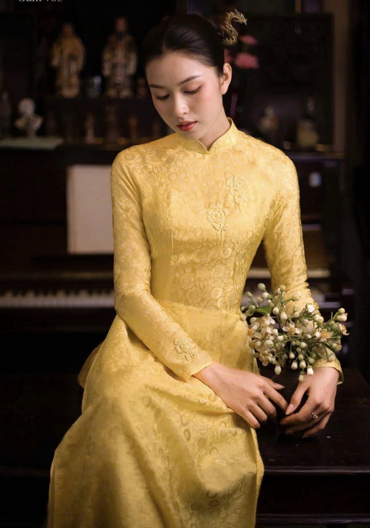 HD108 Áo only - Áo dài lụa hà đông đính ngọc màu vàng