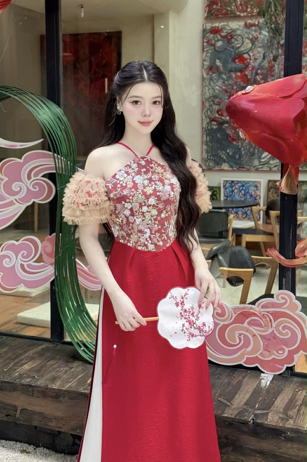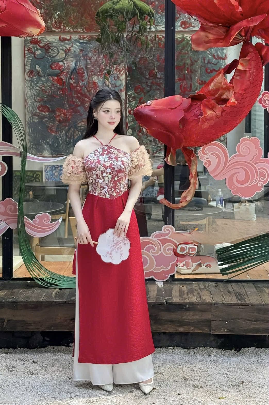 M305 Áo + quần - Áo dài cách tân yếm tay nhún màu đỏ