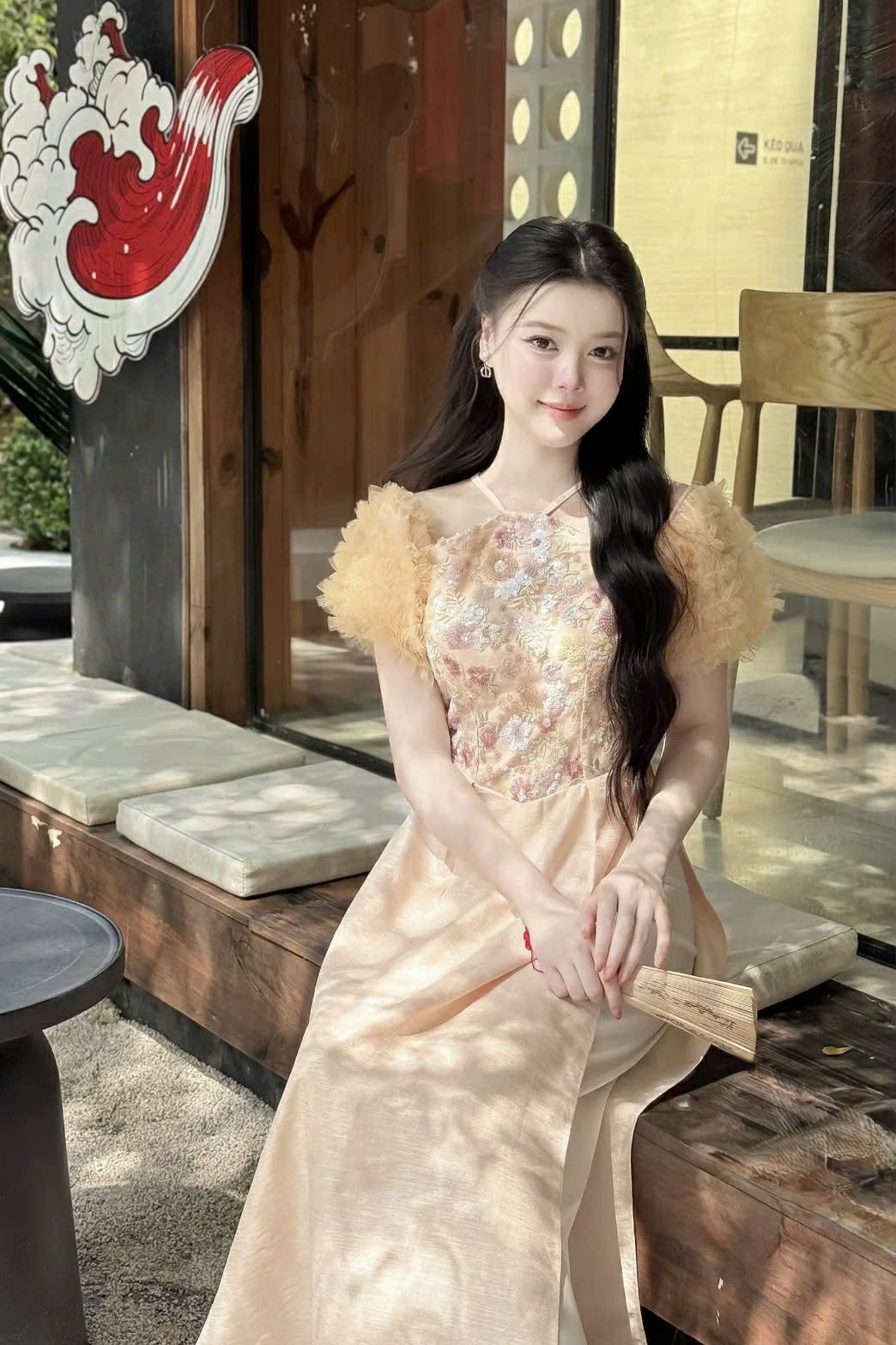 M307 Áo + quần - Áo dài cách tân yếm tay nhún màu be nâu
