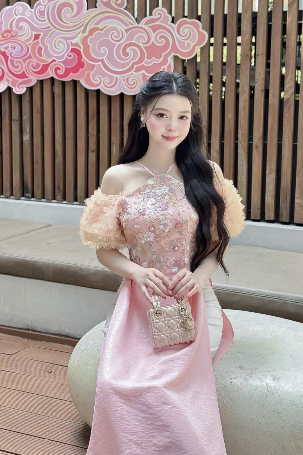 M306 Áo + quần - Áo dài cách tân yếm tay nhún màu hồng
