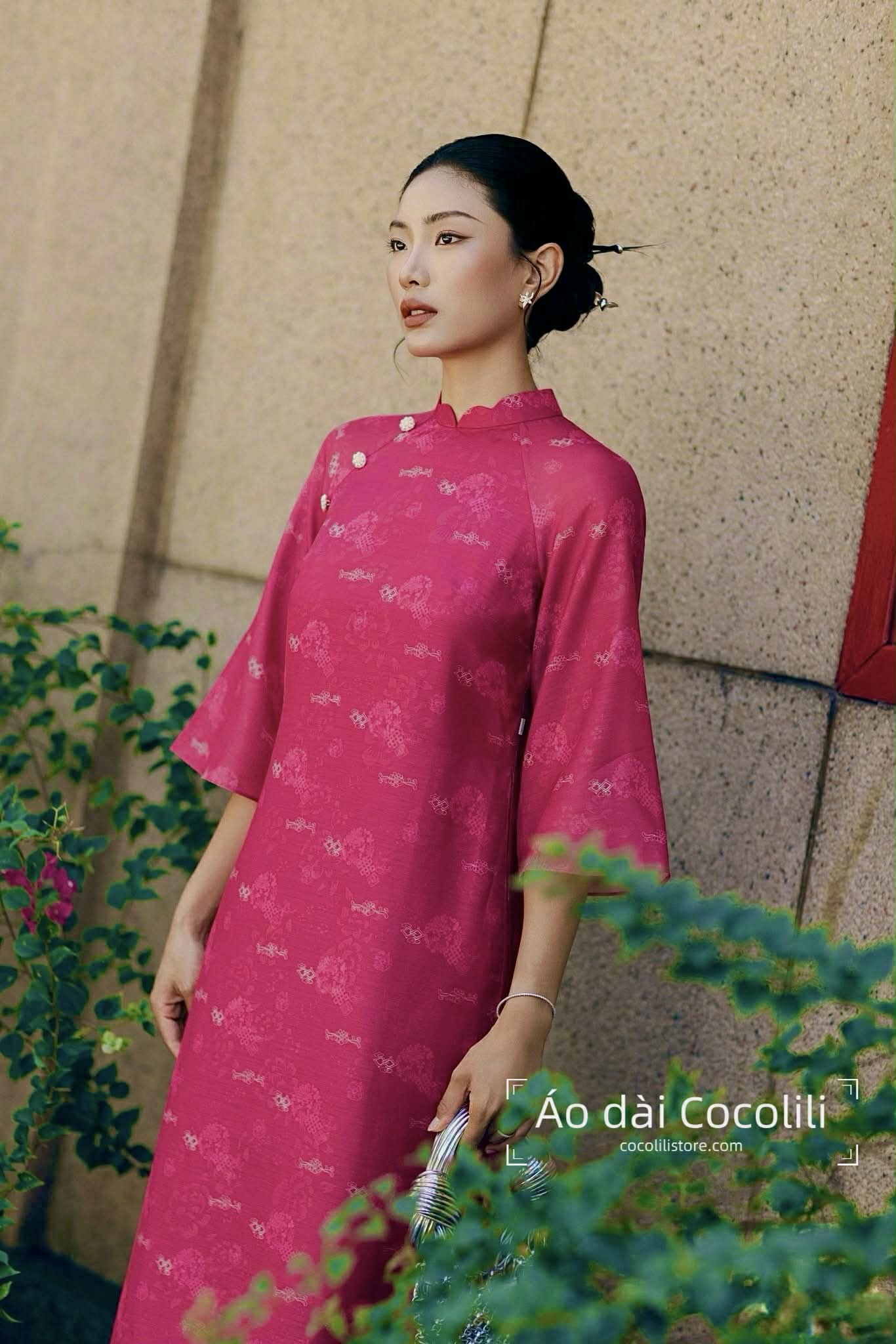 M348 Áo hồng sen + quần hồng - Áo dài tơ dáng suông 4 tà