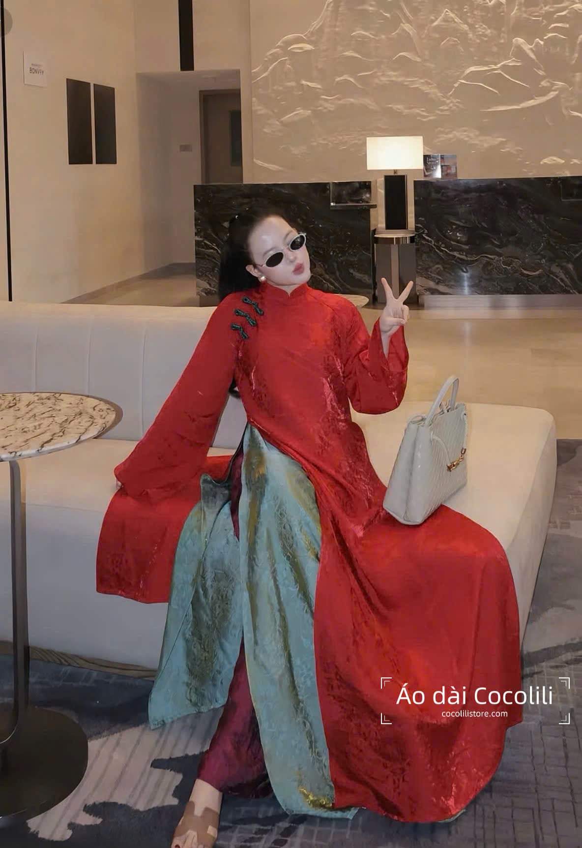 M371 Áo + quần tằm - Áo dài dáng suông 4 tà tằm ánh kim tencel màu đỏ