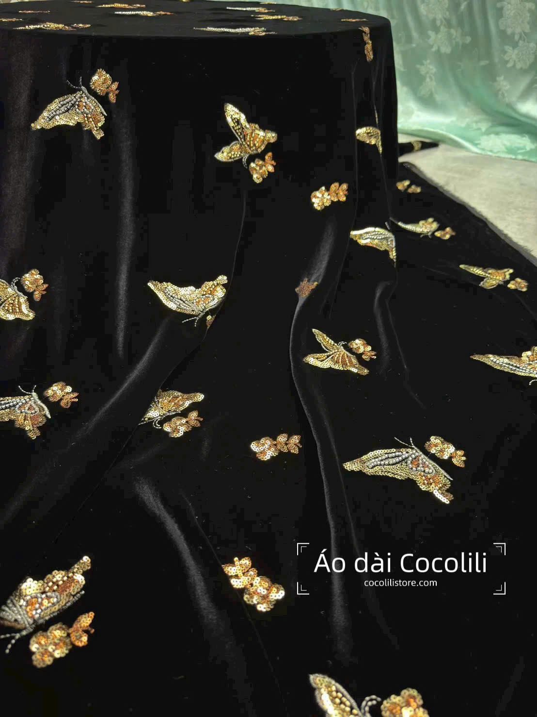 M389 Áo nhung + quần nhũ đỏ - Áo dài dáng suông nhung đen sequin bướm vàng