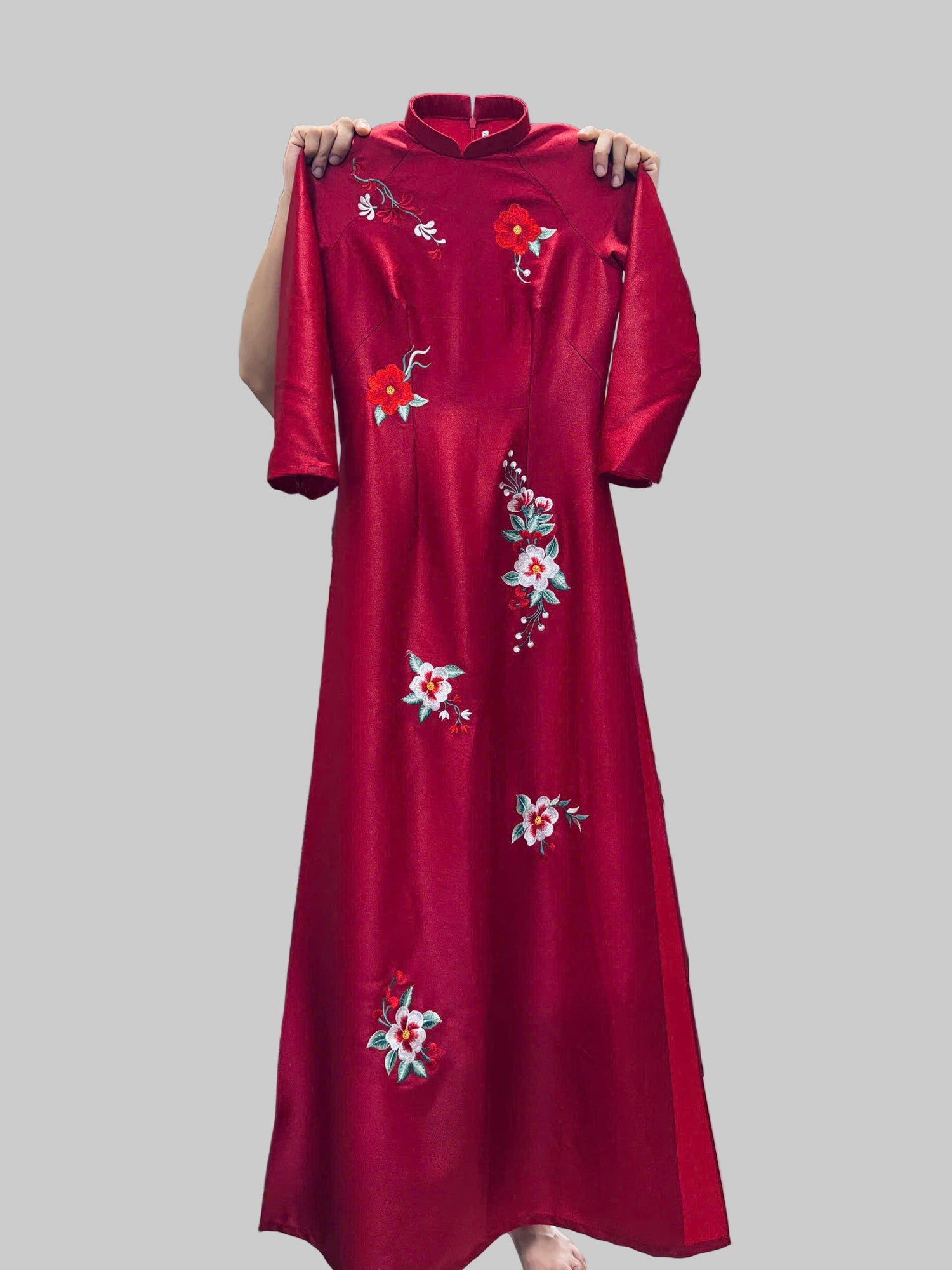 T603 Áo only - Áo dài lụa ánh sao thêu hoa đỏ