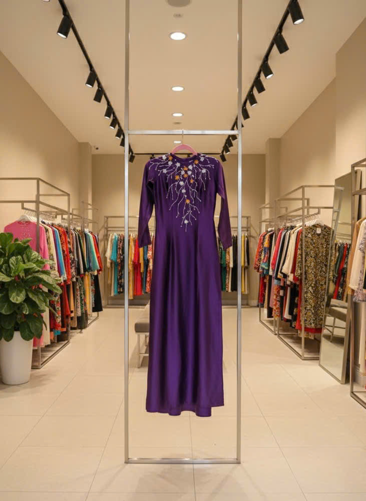 T610 Áo only - Áo dài lụa valentino đính kết màu tím