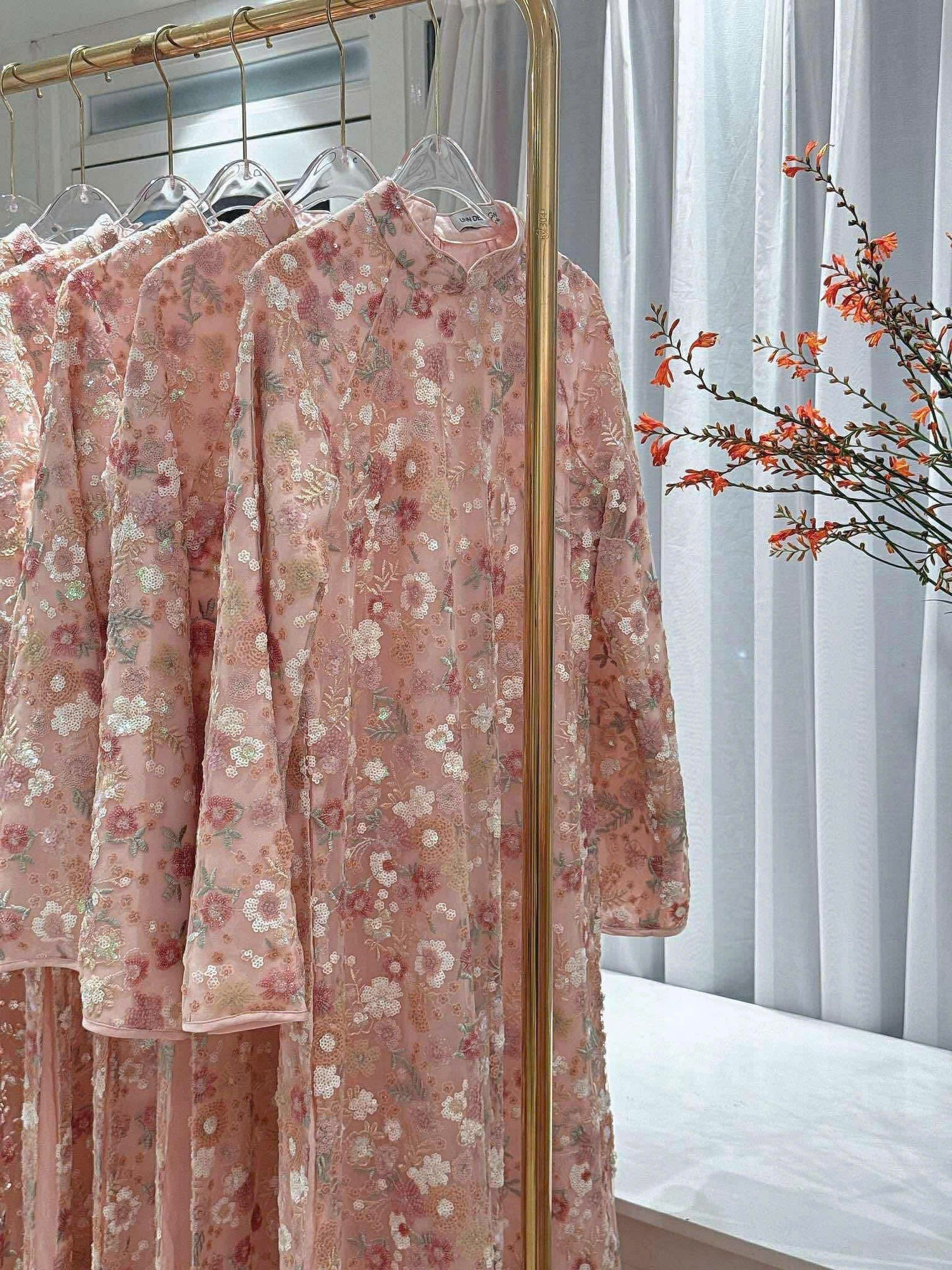 T616 Áo only - Áo dài tơ 4 tà đính kết màu hồng nude